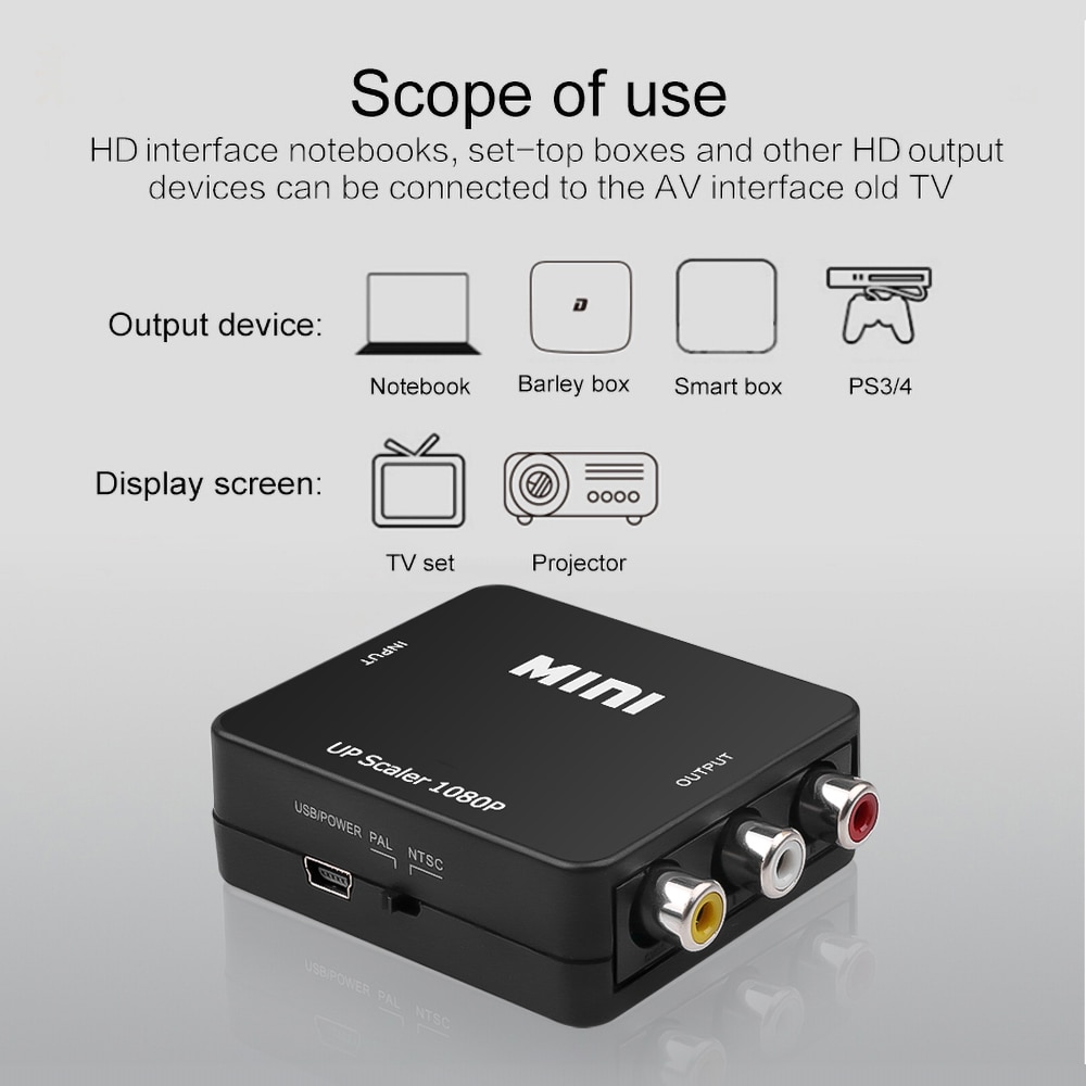 Он преобразует сигналы RCA (AV, композитный, CVBS) в сигналы HD, чтобы вы могли смотреть видео на современном телевизоре с портами HD.