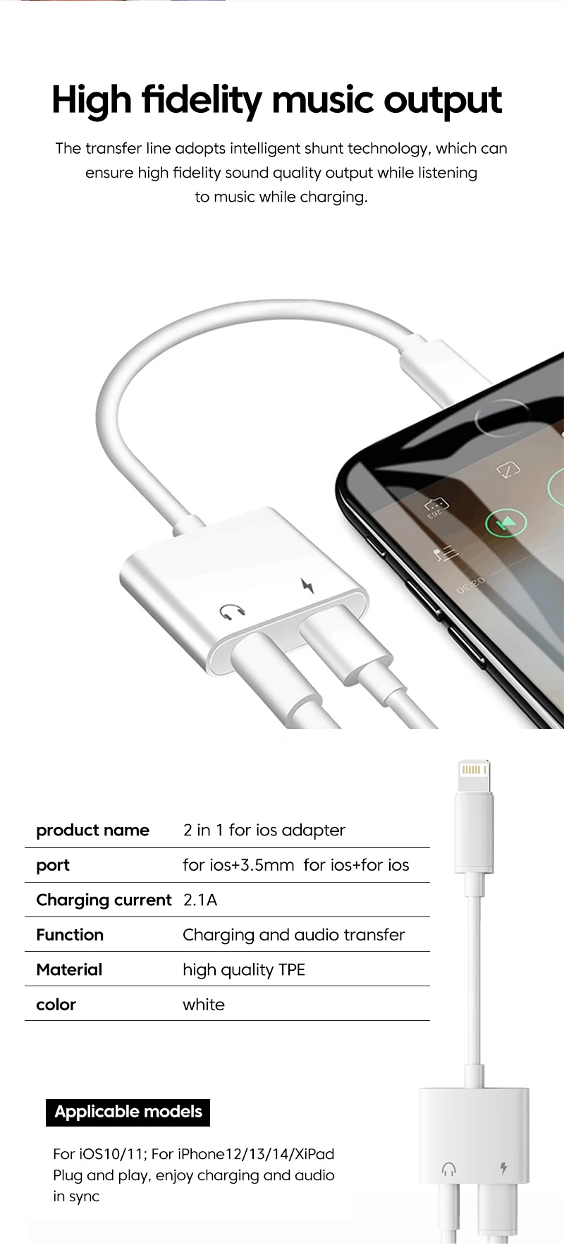 Аудиоадаптер 2 в 1 для iPhone, со штекером Aux и разъемом 3,5 мм для наушников