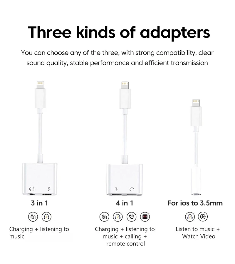 Освещение + 3,55 мм: после включения Bluetooth вставьте кабель адаптера. Поддержка зарядки + прослушивание музыки + вызов, подходит для систем iOS 10 и выше