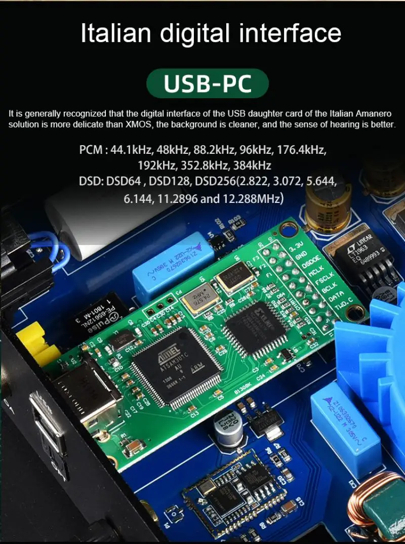 3. USB-карта Amanero более тонкая, чем XMos, и имеет более чистый фон, поддерживает PCM 384 кГц и DSD512.