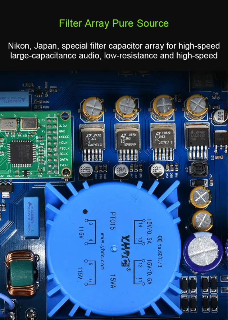 2. Один чип декодера ES9038Q2M на канал спроектирован симметрично, с большим разрешением и разделением каналов.