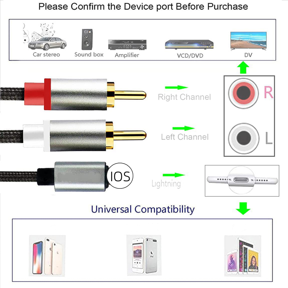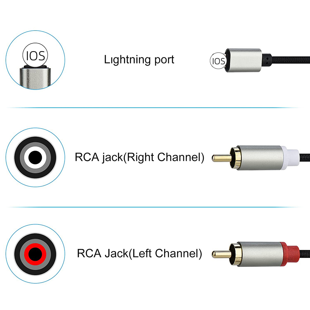 【Широкая совместимость】-Совместимость с телефоном SE/11 Pro Max/11 Pro/11/XS Max/XS/XR/X/8/8 Plus/7/7 Plus и Pad Pro/Air/Mini/Pod коснитесь динамика, стерео приемник, автомобильный усилитель мощности динамика Aux, автомобильная стереосистема, домашний кинотеатр или другое устройство RCA. (ПРИМЕЧАНИЕ: белые/левые и красные/правые розетки)