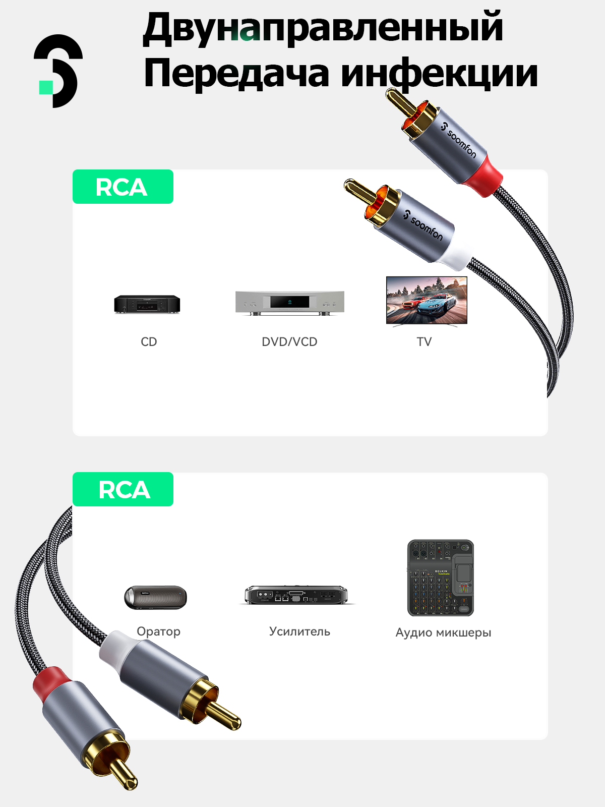 Поддерживаемые устройства: домашняя система Hi-Fi, автомобильная стереосистема, звуковая панель, проигрыватель, динамик, микшер, усилитель или другое устройство, оборудованное 2RCA.