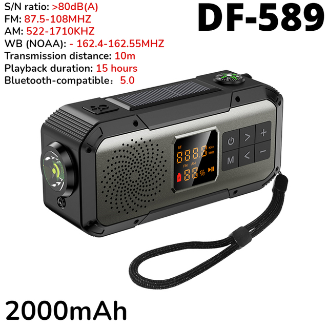 НОВЕЙШИЙ ДИЗАЙН: это радио с рукояткой и самой большой сменной литий-ионной батареей емкостью 5000 мАч, самые мощные функции освещения включают сверхяркий фонарик и лампу для чтения, а также индикатор заряда батареи. Совершенно Новая цветная упаковка коробки, лучший подарок. DF-580-лучшее значение для аварийного радио на этом рынке.