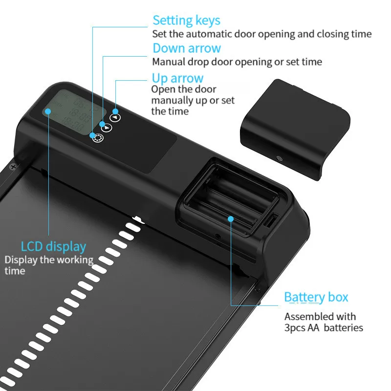 3. Простота использования: Используйте кнопки для легкого программирования. Время переключения дверцы для кур можно свободно устанавливать в соответствии с местным временем с помощью 24-часовых часов. ЖК-дисплей с большим экраном хорошо виден.