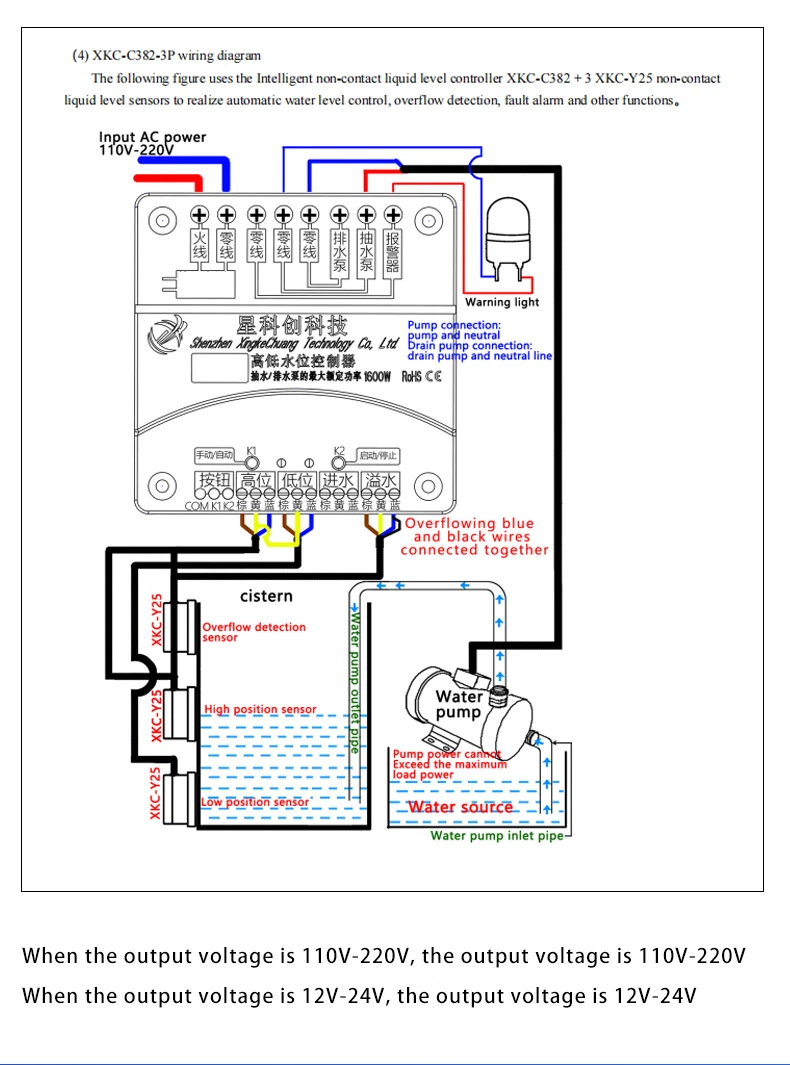 XKC-C382-110V-220V-XP high and low level controller and two non-contact liquid level detection heads realize the function of liquid level high and low control: when the container liquid level is too low, the low liquid level alarm signal sent by the low liquid level sensor is triggered to trigger C382 The controller closes the relay and starts the water pump to add the liquid level. When the liquid level reaches a certain height, the high liquid level sensor sends out a signal to trigger the C382 controller to open the relay and automatically stop the water pump to work in this way. Thereby, the function of automatic control of the container liquid level is realized, and the container liquid level is kept stable.