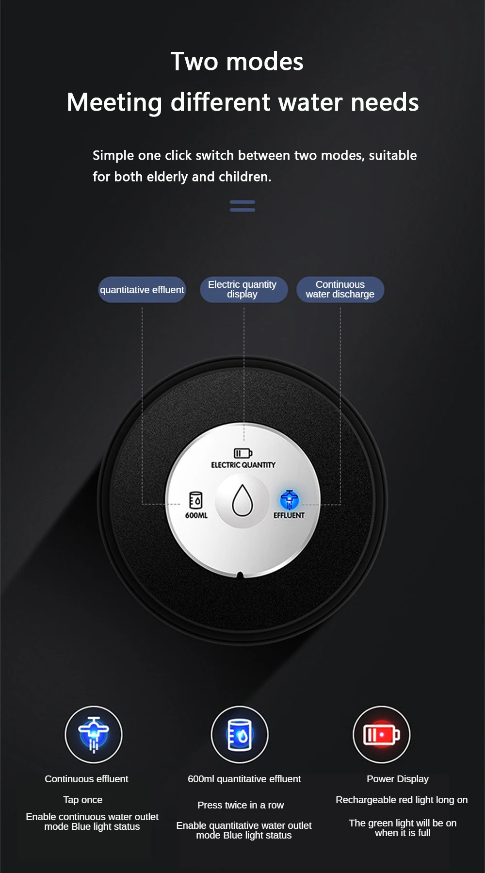 2. Два режима, удовлетворение различных потребностей в воде, простой щелчок, переключение между двумя режимами, будут использоваться пожилыми людьми и детьми.