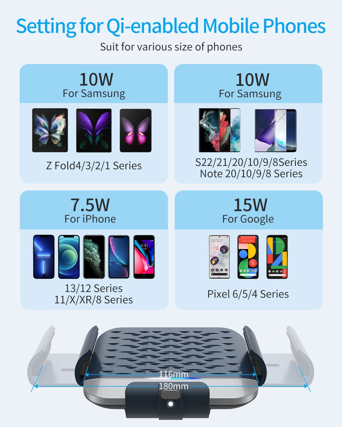 • Быстрая Беспроводная зарядка мощностью 15 Вт-Совместимость со всеми зарядными телефонами Qi, включая iPhone 8 серии, iPhone X серии, iPhone 13 12 11 серии, iPhone 12 серии; серия Samsung S6/S7/S8/S9/S10/S20/S21; Samsung W21 5G, Galaxy Z Fold 3, Galaxy Z Fold 2 Thom Browne, Galaxy Note20 Series, Samsung W20 5G, Samsung Galaxy Fold,Huawei Mate X2,Mate XS,Mate X, сяоми Микс Сложить