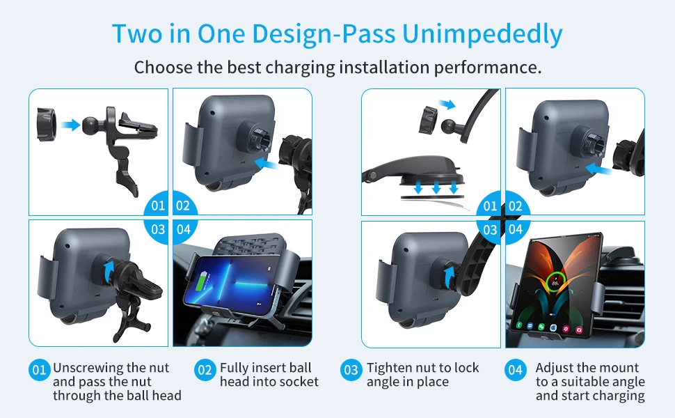 • Беспроводное автомобильное зарядное устройство и крепление Qi: беспроводное автомобильное зарядное устройство Qi сочетает в себе держатель для телефона с вентиляционным отверстием и беспроводное автомобильное зарядное устройство. Это зарядное устройство для беспроводного телефона Qi со встроенным интеллектуальным чипом может защитить ваш телефон от перезарядки, перегрузки по току, короткого замыкания, перегрева и т. Д.