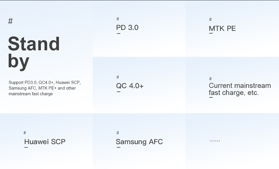 Поддерживает основную быструю зарядку, такую как PD3.0,QC4.0 +,Huawei SCP,Samsung AFC,MTK PE + и т. Д.