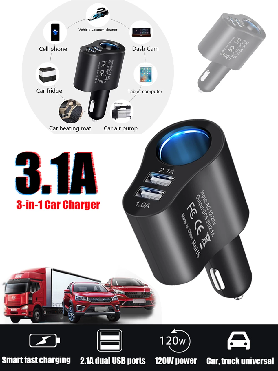 HKGK 3.1A Dual USB 3 в 1 Автомобильное зарядное устройство 3 порта 12-24 В прикуриватель