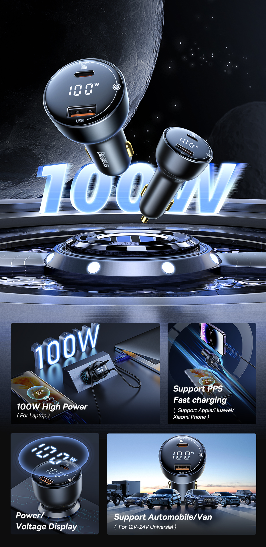 Автомобильное зарядное устройство Baseus 100 Вт с быстрой зарядкой