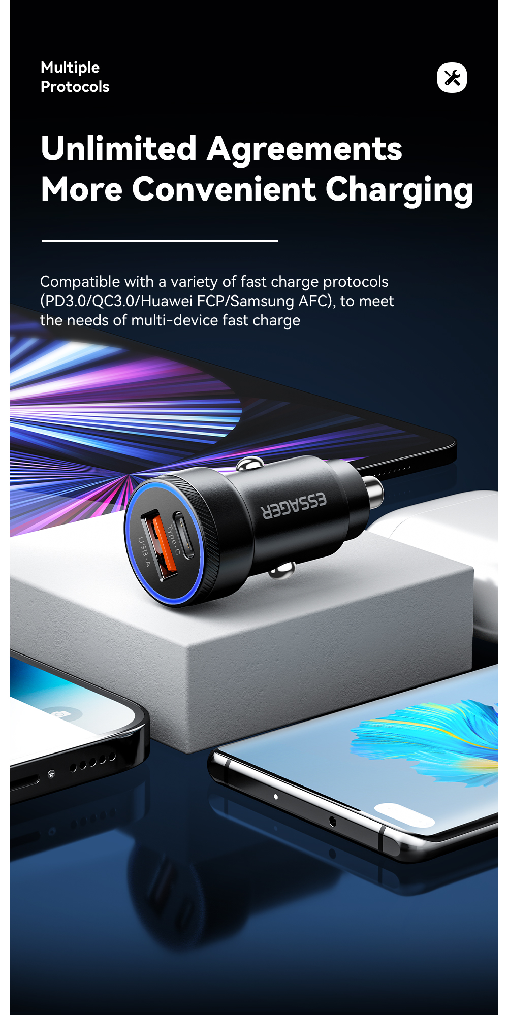 -Особенность 3: совместимость со многими протоколами (для PD3.0/ QC3.0/ Huawei FCP/ AFC и других основных моделей быстрой зарядки)