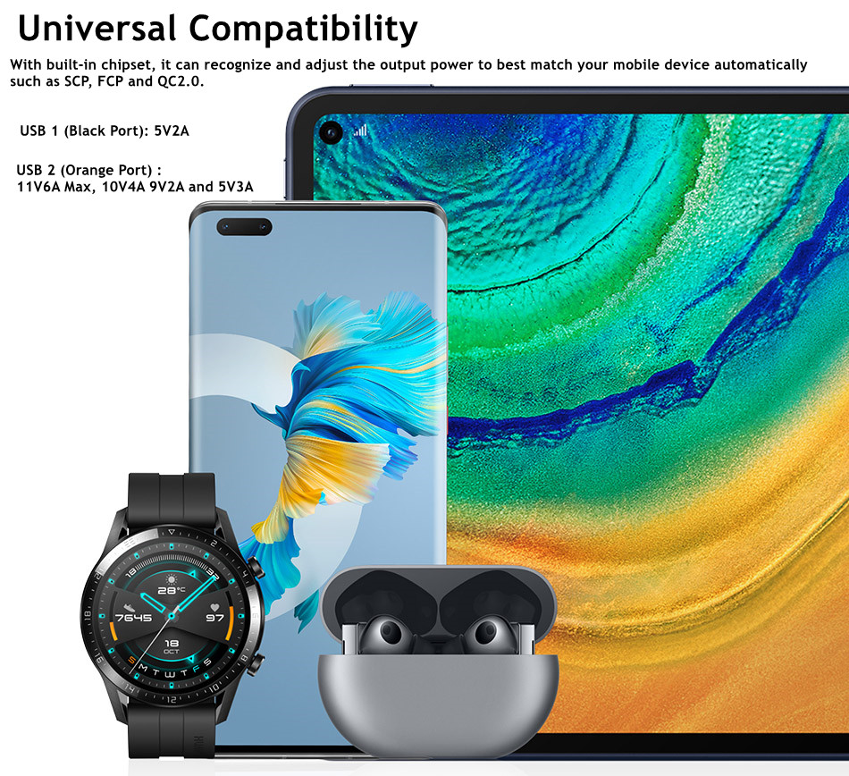 Выход USB: 11V6A Max или 10V4A или 5V3A (оранжевый порт); 5V2A (черный порт)