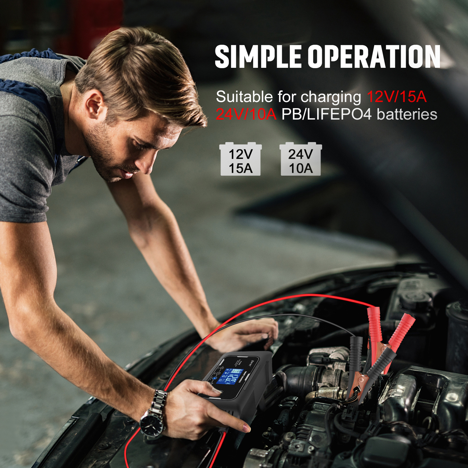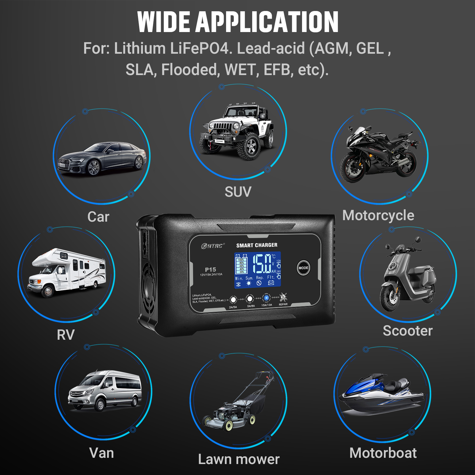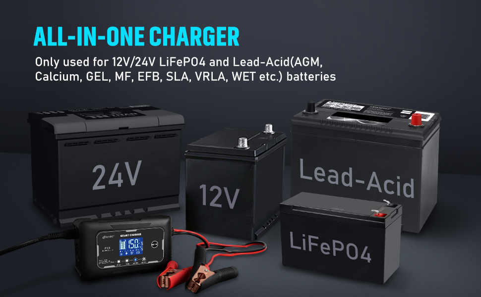 Подходит для: литиевых/LiFePO4/свинцово-кислотных (AGM,GEL,Calcium,EFB, MF, FLOODED, VRLA, SLA и влажных батарей ..)