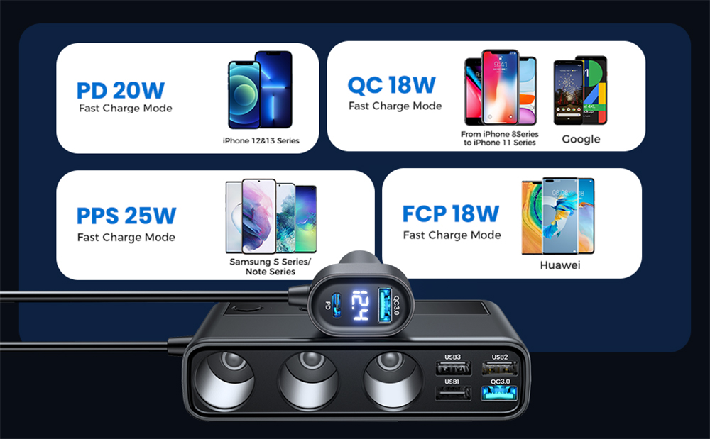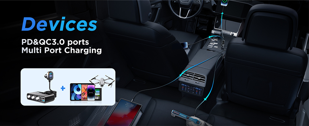 • 【Независимый выключатель питания】Мы обновили независимый переключатель для каждого разветвителя прикуривателя, не только эффективно продлевая срок службы адаптера автомобильного зарядного устройства USB C, но и избавляя вас от многократного подключения и выключения.