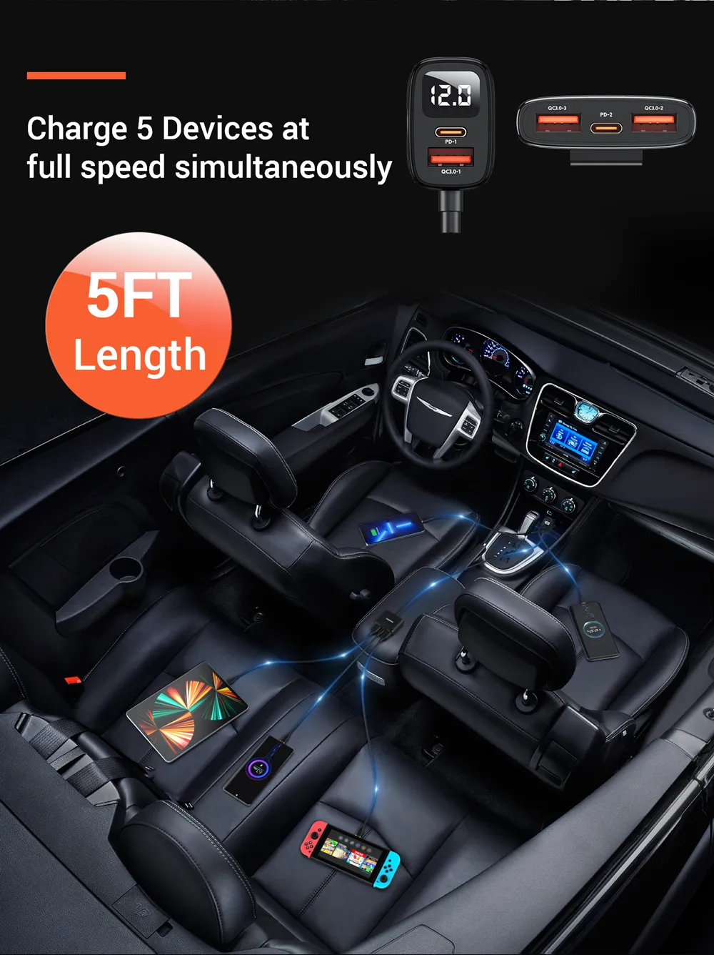 Автомобильное зарядное устройство с 5 USB-портами, 78 Вт, QC3.0 PD3.0