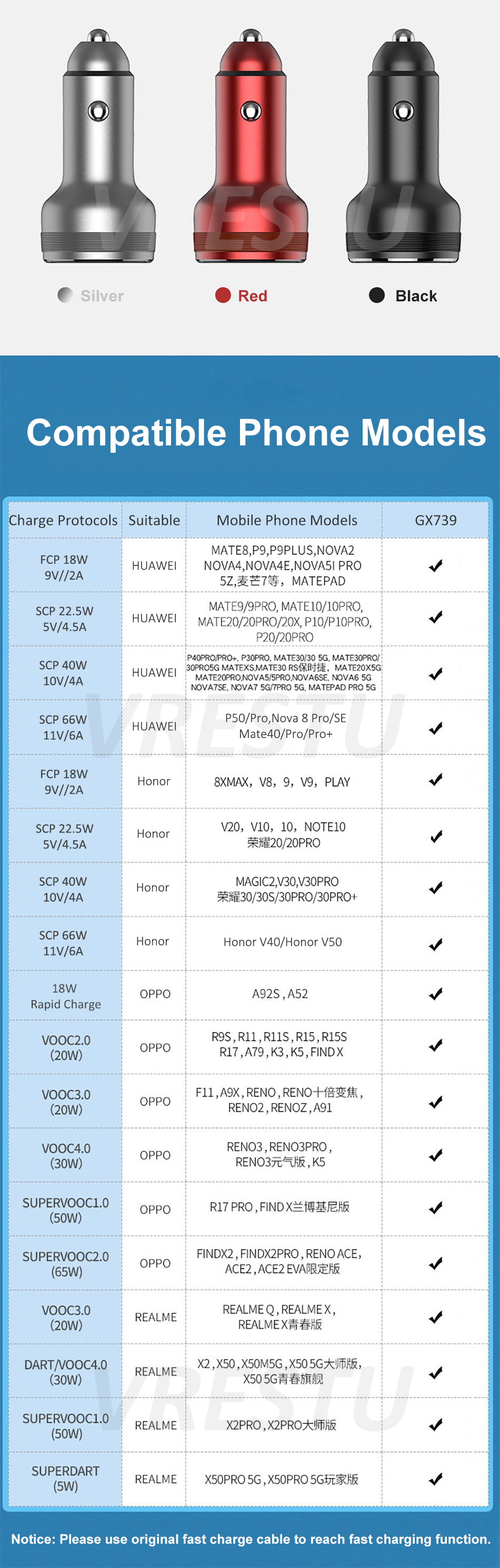 <span class="SnowProductCharacteristics_SnowProductCharacteristicsItem__titleContent__534v9">Protocol 2</span> Fast Charger for OPPO VOOC Realme Super Dart QC 3.0 2.0 6.5A High Current