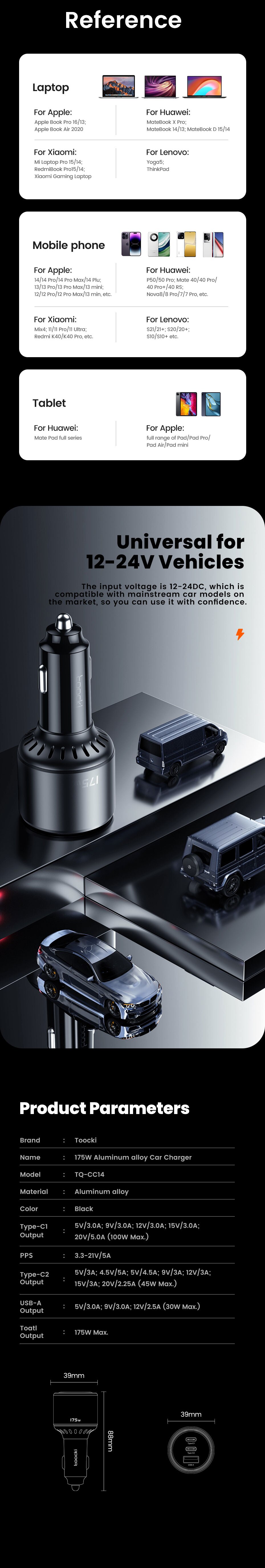 Автомобильное зарядное устройство Toocki с USB-портом, 175 Вт, PD3.0, QC4.0 PPS
