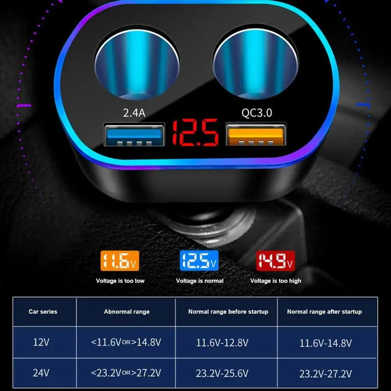 * 1. 12/24 В Автомобильное зарядное устройство, светильник-дозатор для сигарет с двойным USB, двойной светильник для сигарет, цифровой вольтметр и цветной светодиодный светильник.