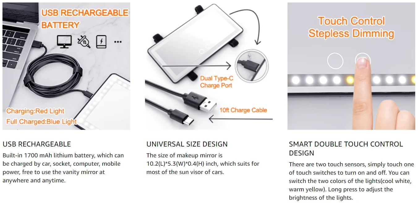 1. Светодиодный светильник с регулируемой яркостью S: ваше зеркало входит в солнцезащитный козырек, поэтому светильник даже на вашем лице. Вы можете сделать свой макияж с этим зеркалом с безупречными результатами из-за безупречного освещения. Включая 3 режима цветного освещения и плавную функцию затемнения, которая может быть затемнена или усилена для ваших нужд. Длительное нажатие для затемнения в соответствии с тем, что вам нужно.