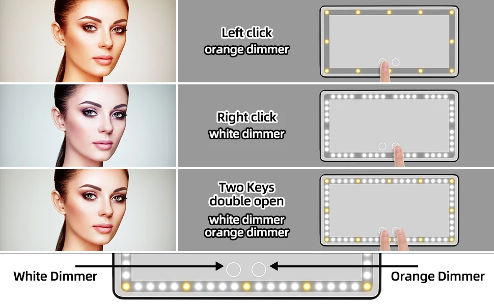 3. Умный двойной сенсорный дизайн управления: Есть два сенсорных датчика, просто коснитесь одного сенсорного переключателя для включения и выключения. Вы можете переключить два цвета света (холодный белый, теплый желтый). Длительное нажатие для регулировки яркости света. Функция памяти делает это зеркало с подсветкой возвращенным к той же яркости и цвету при последующем использовании.