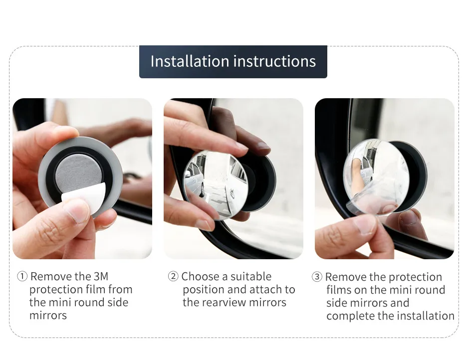 【Легко установить 】 пожалуйста, очистите свои оригинальные боковые зеркала автомобиля, затем Прикрепите зеркала для слепых пятен к монтажному кронштейну и установите их на боковые зеркала заднего вида.