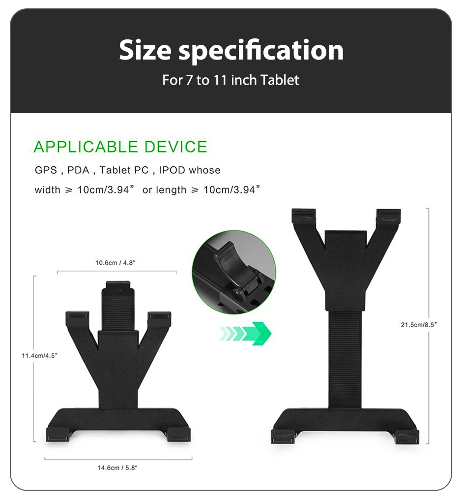 • Регулируемый угол обзора :Регулируемый угол обзора этой подставки для держателя планшета гарантирует, что вы можете расположить устройство под идеальным углом для оптимального просмотра, независимо от того, управляете ли вы или используете его в качестве GPS.