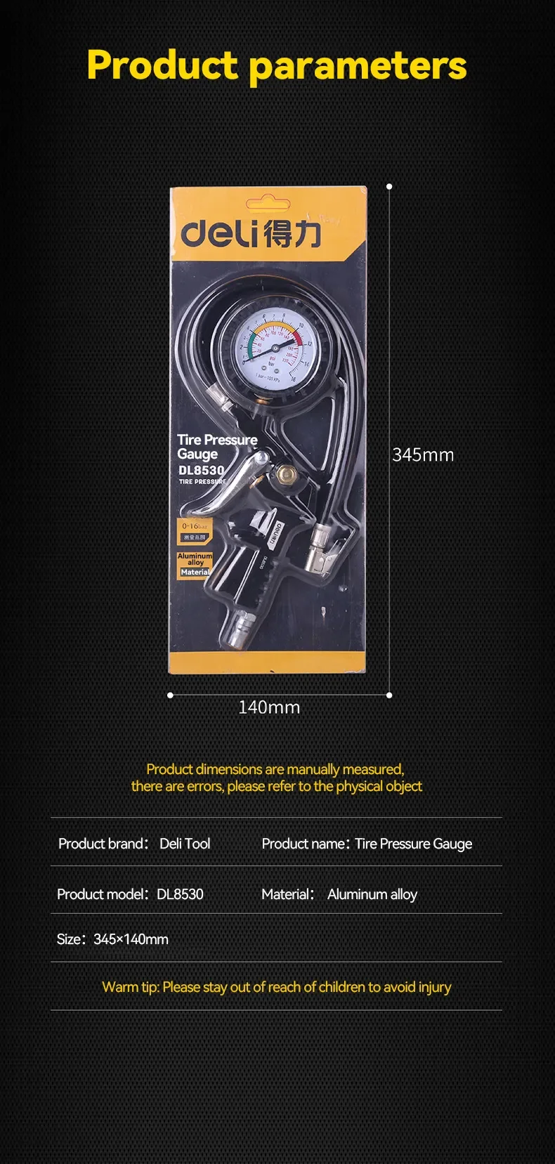 • Долговечность:Изготовленный из высококачественных материалов, манометр Deli Tire рассчитан на длительный срок службы, гарантируя, что вы получите максимальную отдачи от своих инвестиций.