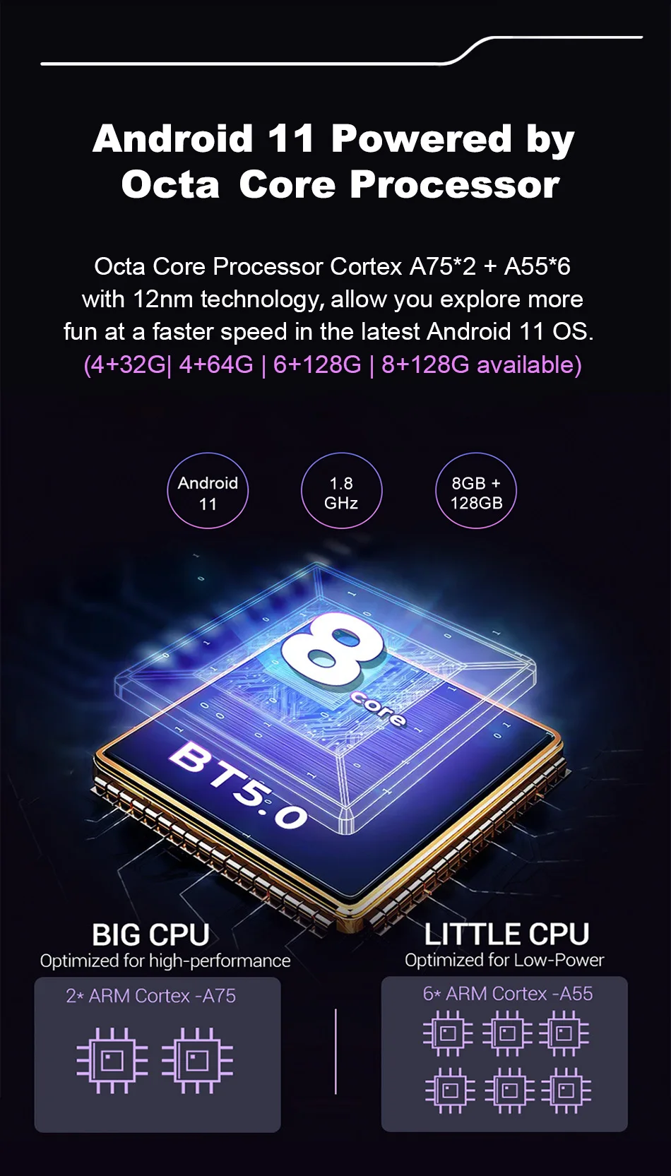 1. Последняя ОС Android 11, работающая от восьмиядерного процессора (Cortex A75 * 2 + A55 * 6)