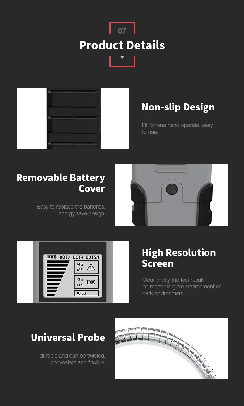 • Дисплей индикатора СИД :Светодиодный индикатор обеспечивает четкие и легко читаемый результаты, что упрощает понимание состояния тормозной жидкости.
