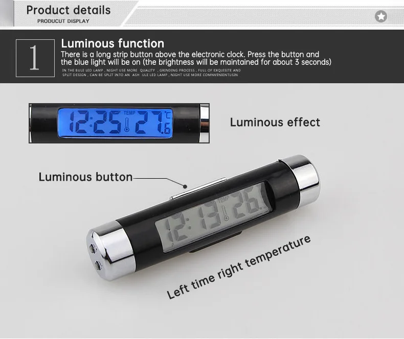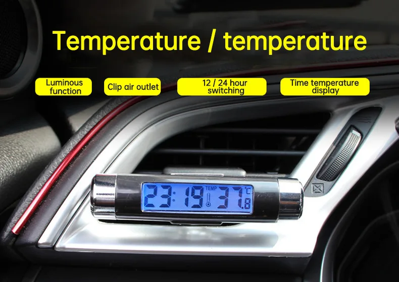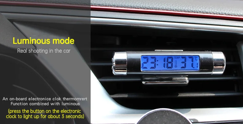 Особенности: Бортовой часовой термометр. Часы, функция отображения температуры, с подсветкой: на подсветке есть кнопка, нажмите ее около 5 секунд, оснащен зажимом, можно закрепить розетку кондиционера/солнцезащитный козырек, удобная установка