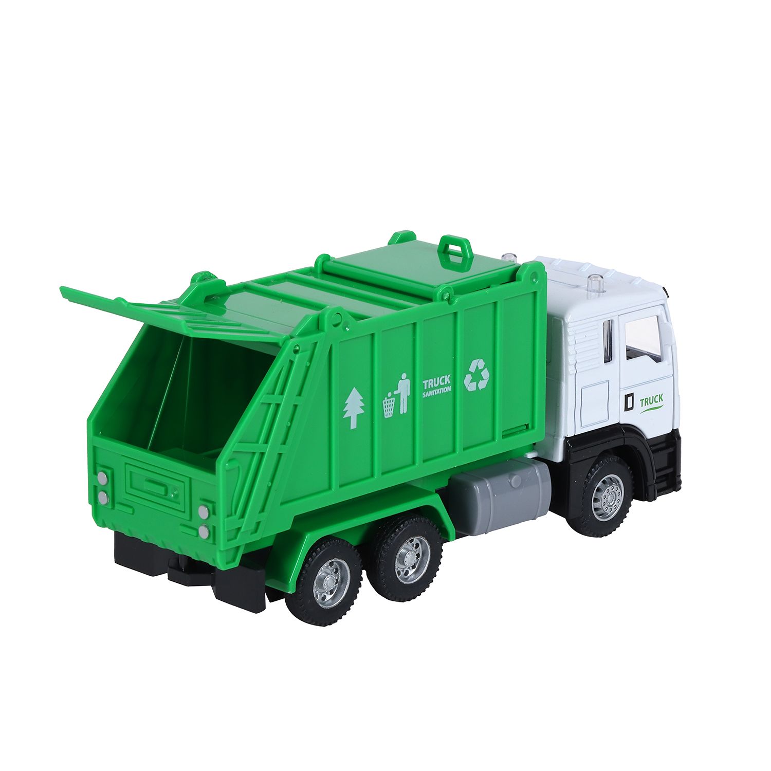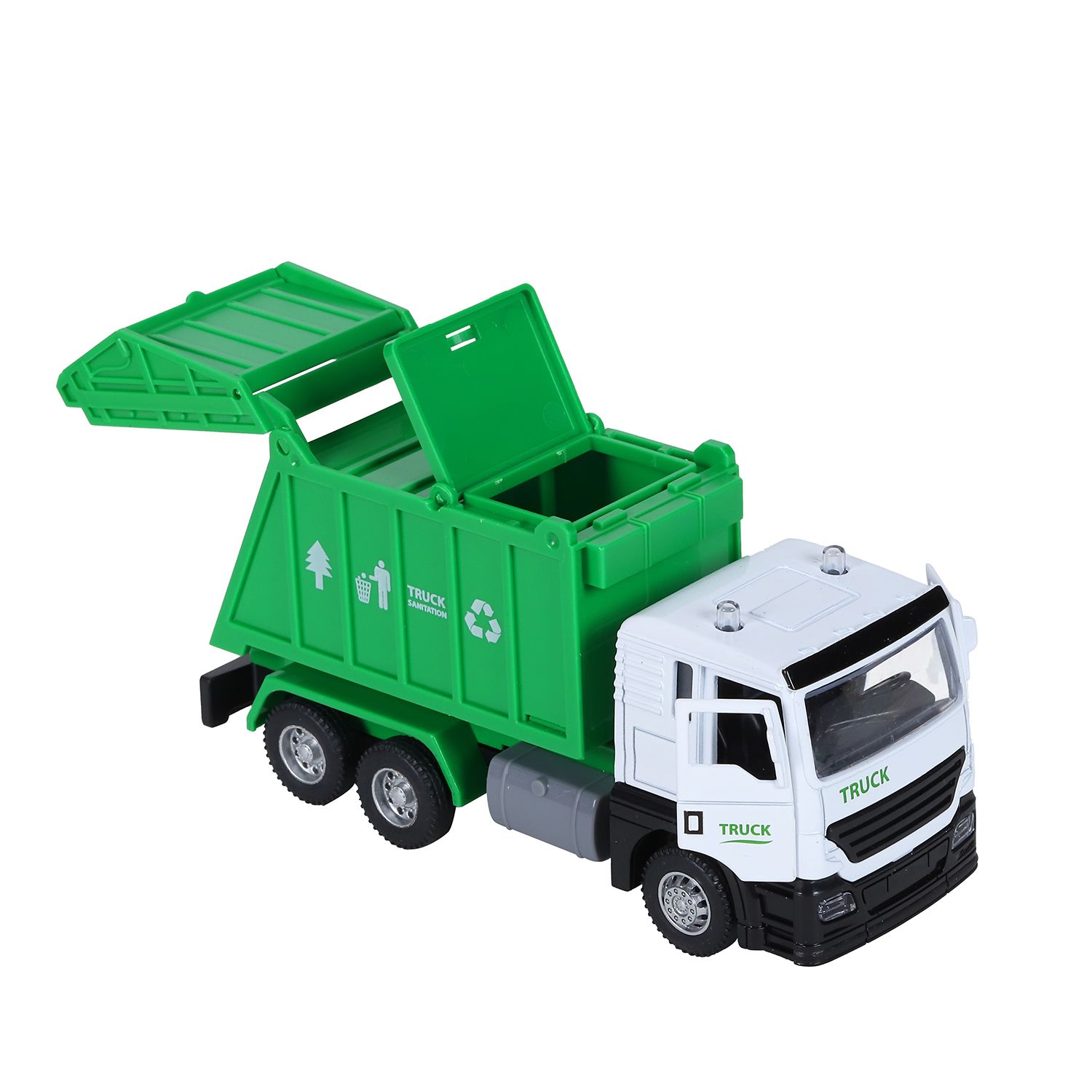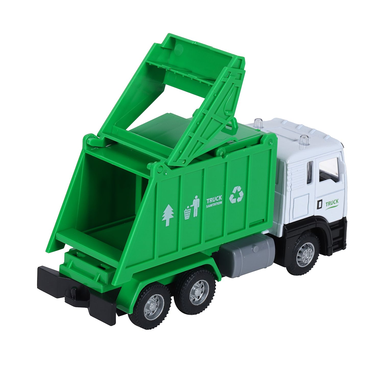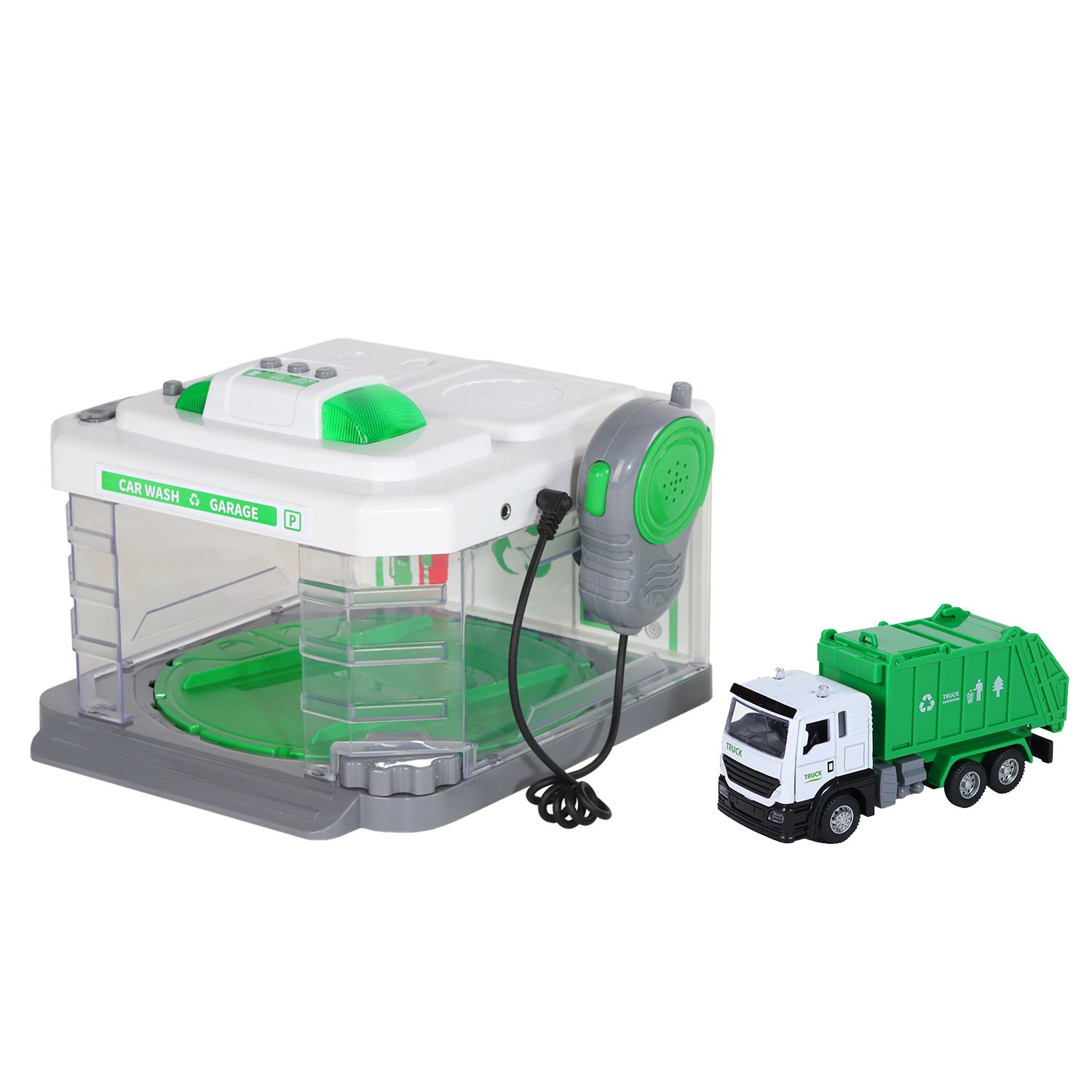 В комплекте с автомойкой идёт металлическая машинка-мусоровоз с подвижными элементами.