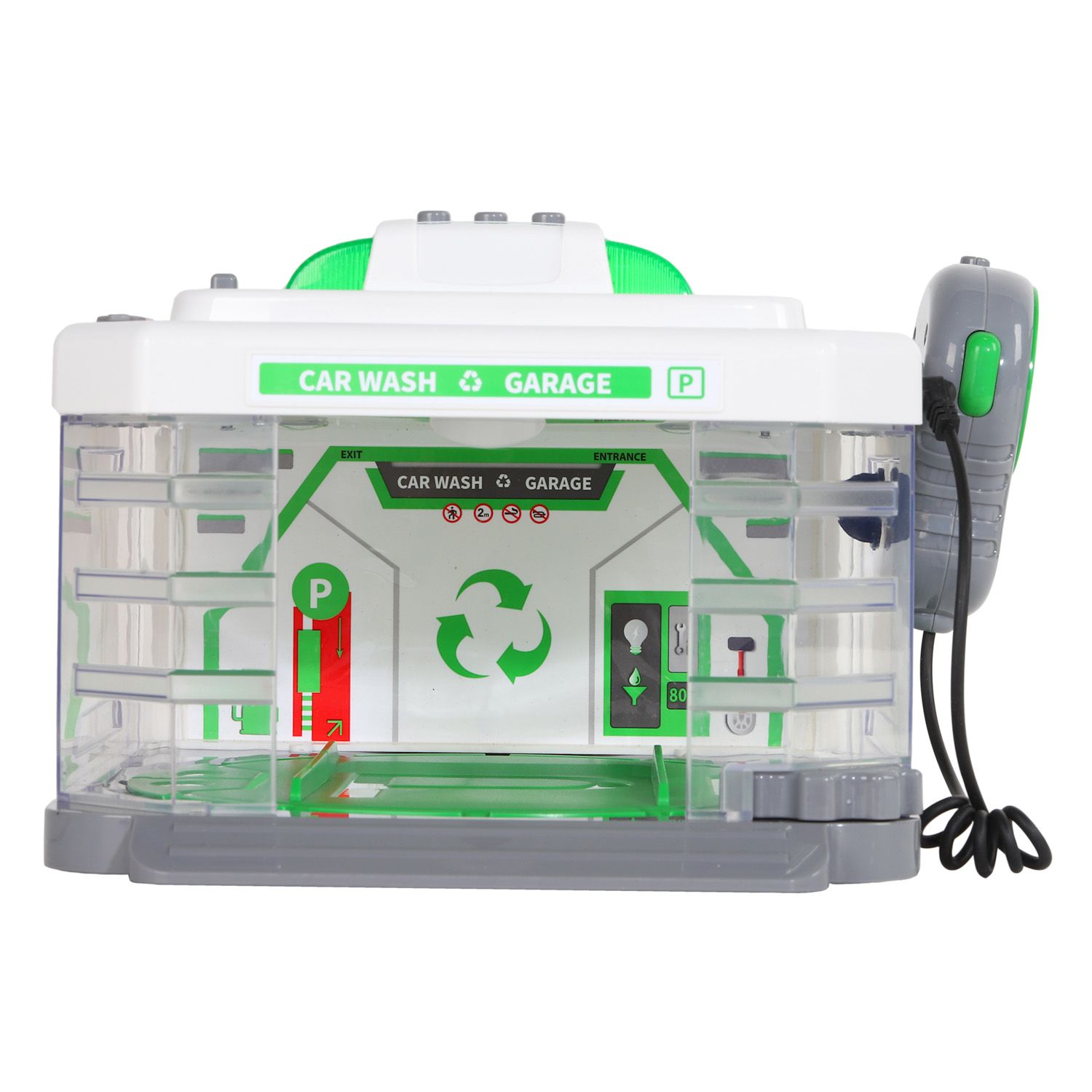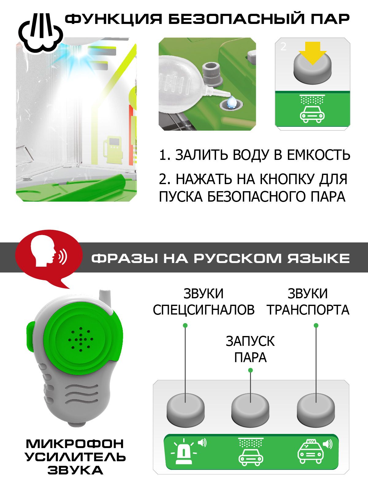Главная особенность игрушки в том, что она генерирует воду в безопасный пар, что создаёт эффект, как на настоящей автомойке.