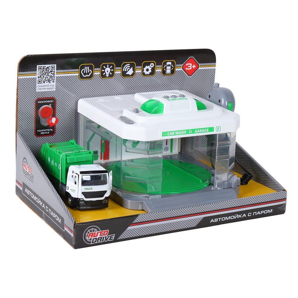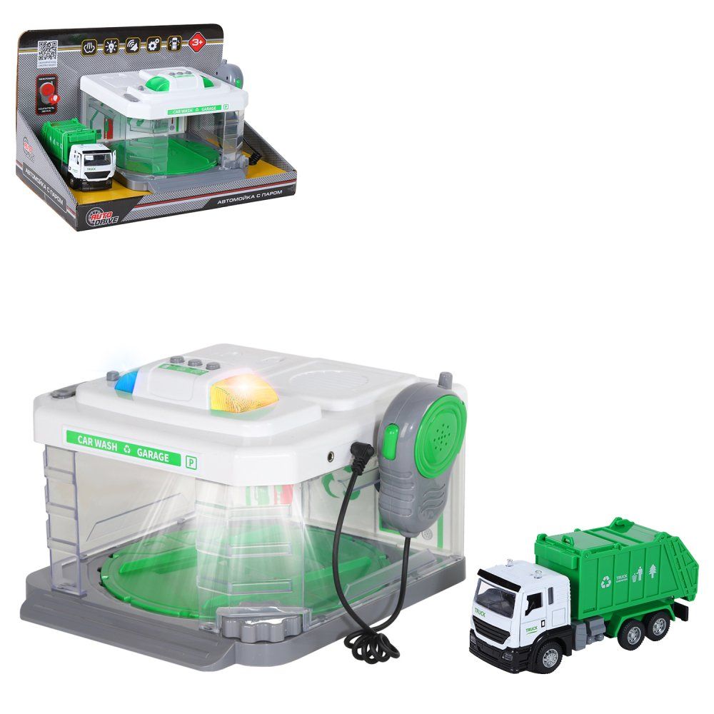 Автомойка игрушечная AUTODRIVE с паром звуком и светом/ металлическая машинка Мусоровоз, спецтехника служба спасения