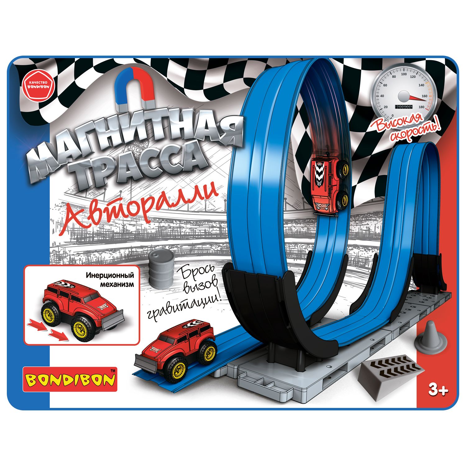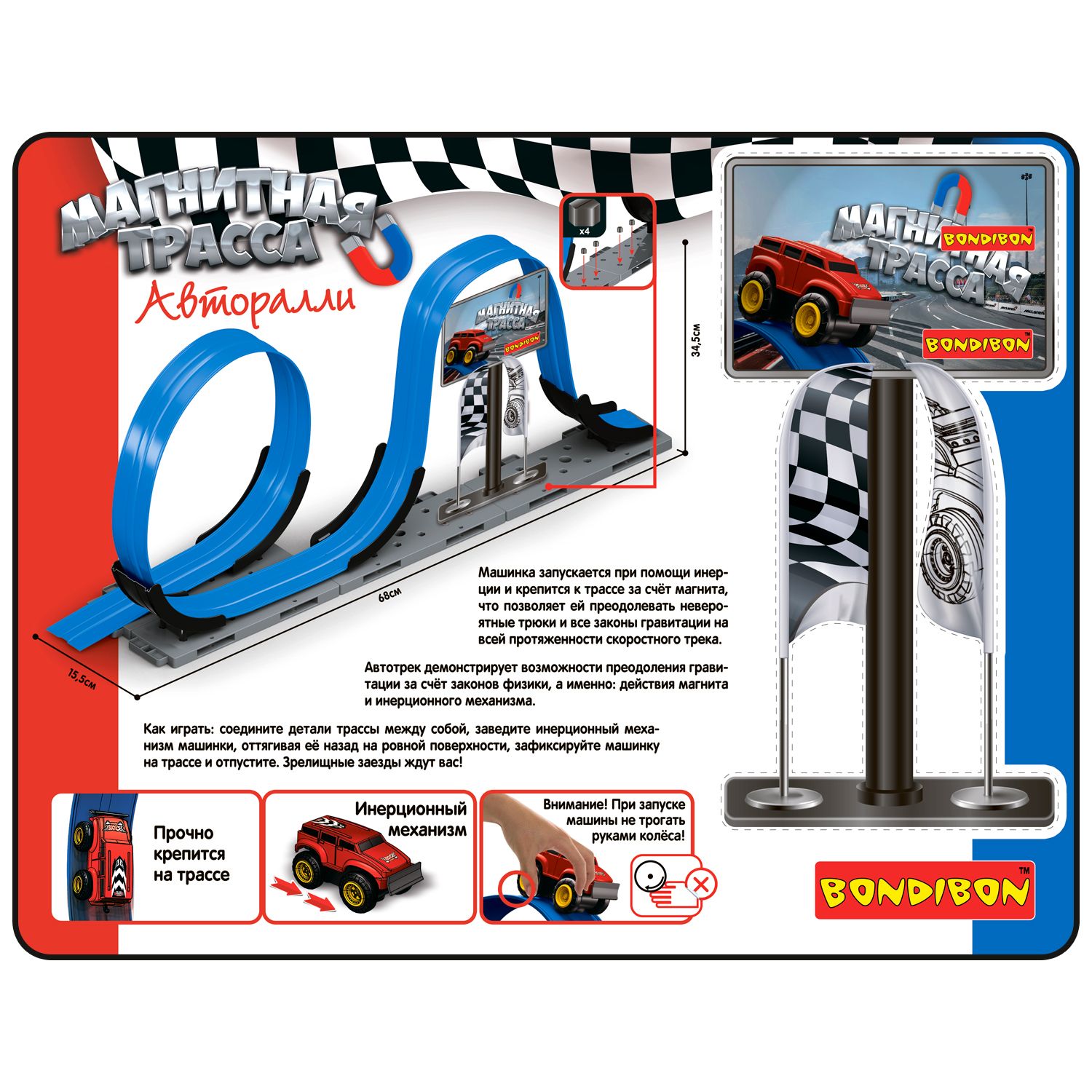 Автотрек МАГНИТНАЯ ТРАССА от Bondibon демонстрирует возможности преодоления гравитации за счёт законов физики: действия магнита и инерционного механизма. Машинка запускается при помощи инерции и крепится к трассе за счёт магнита, что позволяет ей проделывать невероятные трюки на всей протяженности скоростного трека.