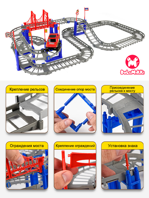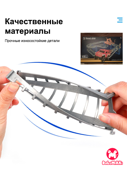 Описание: 1. Гибкий автотрек с внедорожником 73 детали.2. Материал: ABS пластик, электронные компоненты. Машинка-внедорожник работает от 1 батарейки типа АА. В наборе: детали для сборки трека, дорожные знаки, указатели, 5 опор для моста, мост, заправочная станция, машинка-внедорожник, 2 запасных колеса, пальма. Размеры: 38*24*5.5 см. 3. Гибкая гоночная автострада для захватывающих и реалистичных гонок на внедорожнике. Из 73 элементов набора Вы сможете собрать более 100 конфигураций двухуровневой трассы. Второй уровень строится с помощью опор моста, а также самого моста. А благодаря дорожным знакам, ребенок сможет познакомиться с правилами дорожного движения. В наборе представлен внедорожник с большими колесами и мощным протектором.4. Сборка и монтаж трека осуществляется очень просто, справится даже маленький ребенок.5. Все элементы набора изготовлены из прочного нетоксичного пластика, покрытого сертифицированными красителями. Безопасны для детей. Превосходный подарок детям на любой праздник новый год день рождения за успеваемость или поощрить, подходит для совместной игры родители и дети. Кроме того трек для детей обеспечивает всестороннее развитие во время игровой деятельности. Улучшается координация рук и отрабатывается мелкая моторика во время запуска машинок. Развивается логическое, пространственное мышление, понимание причинно-следственной связи. Дает познание о высоте, длине, законах движения предметов. Развивает внимание и усидчивость. Учит коммуникации со сверстниками, при совместной игре. Гоночный трек с машинками - беспроигрышный вариант подарка ребенку от 1,5 лет, развивающие игры для детей