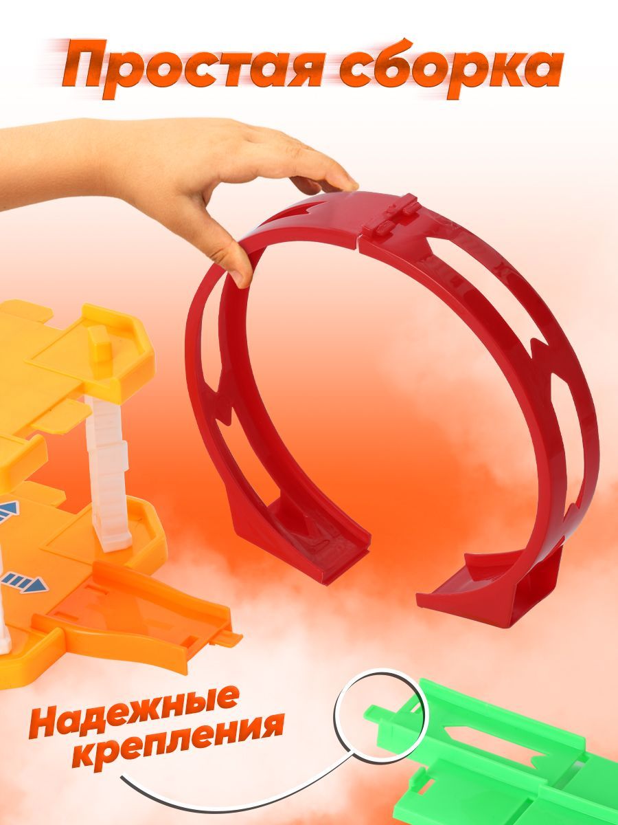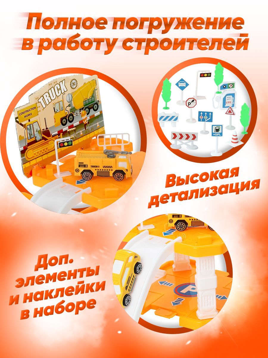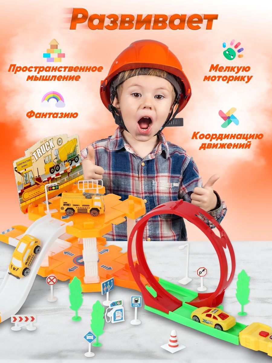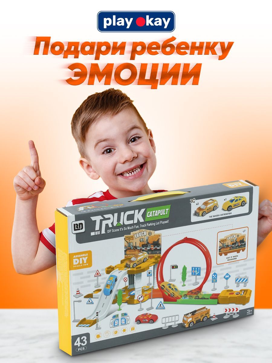 Автотрек парковка для машинок Play Okay Truck, гараж детский с горкой и запуском + дорожные знаки, Конструктор для мальчиков (игровой набор строительной техники Паркинг) / 43 детали