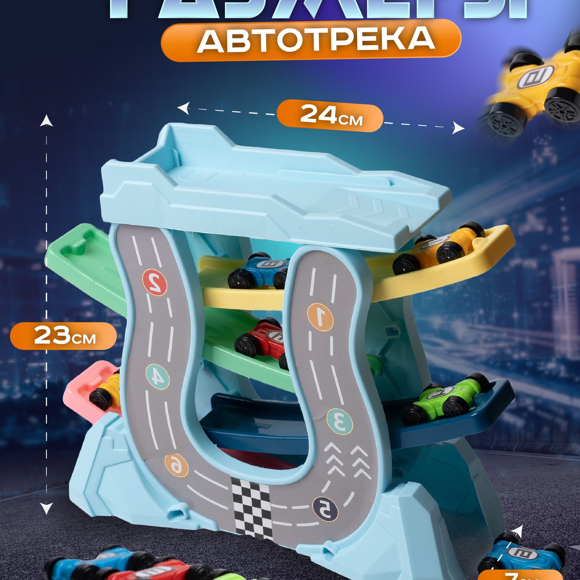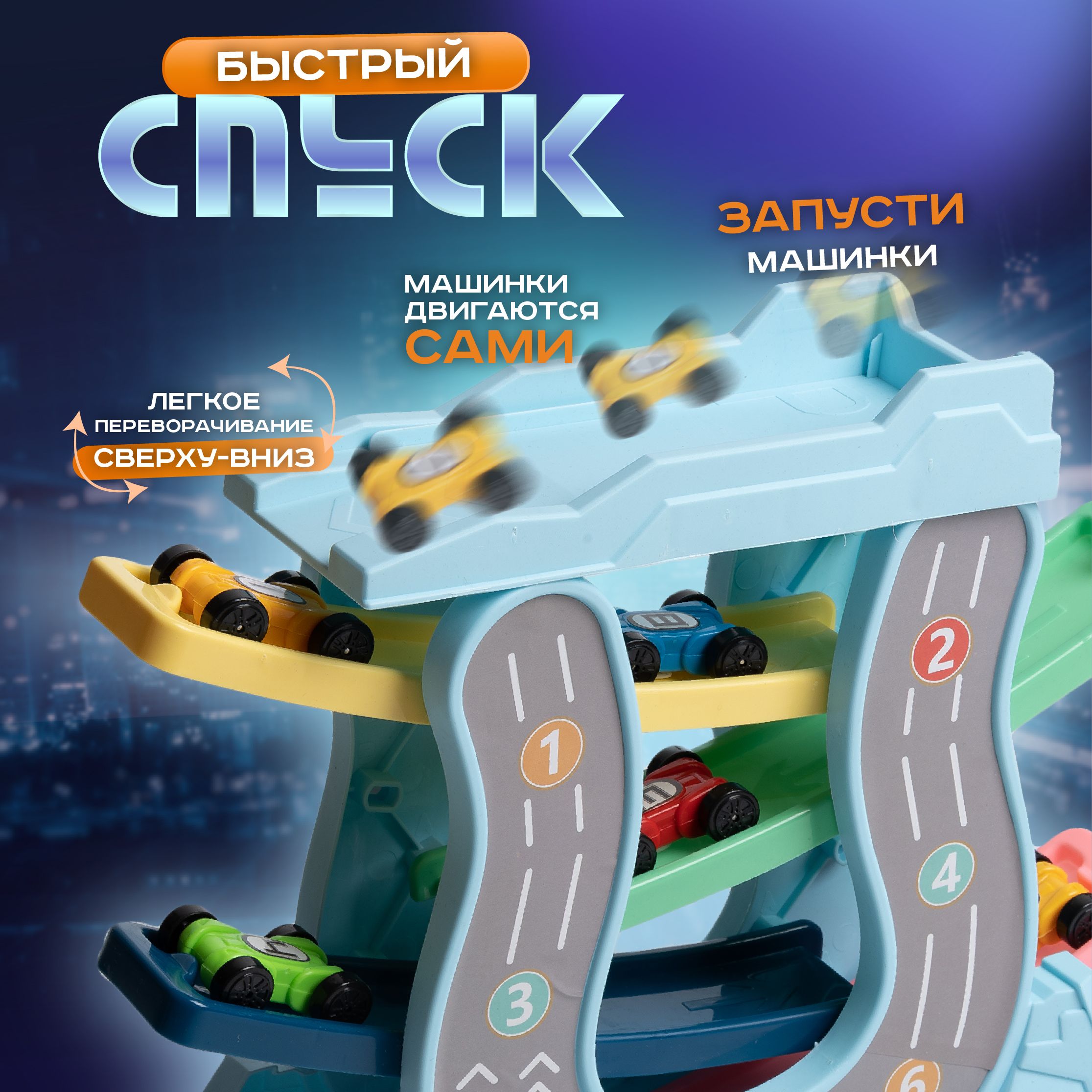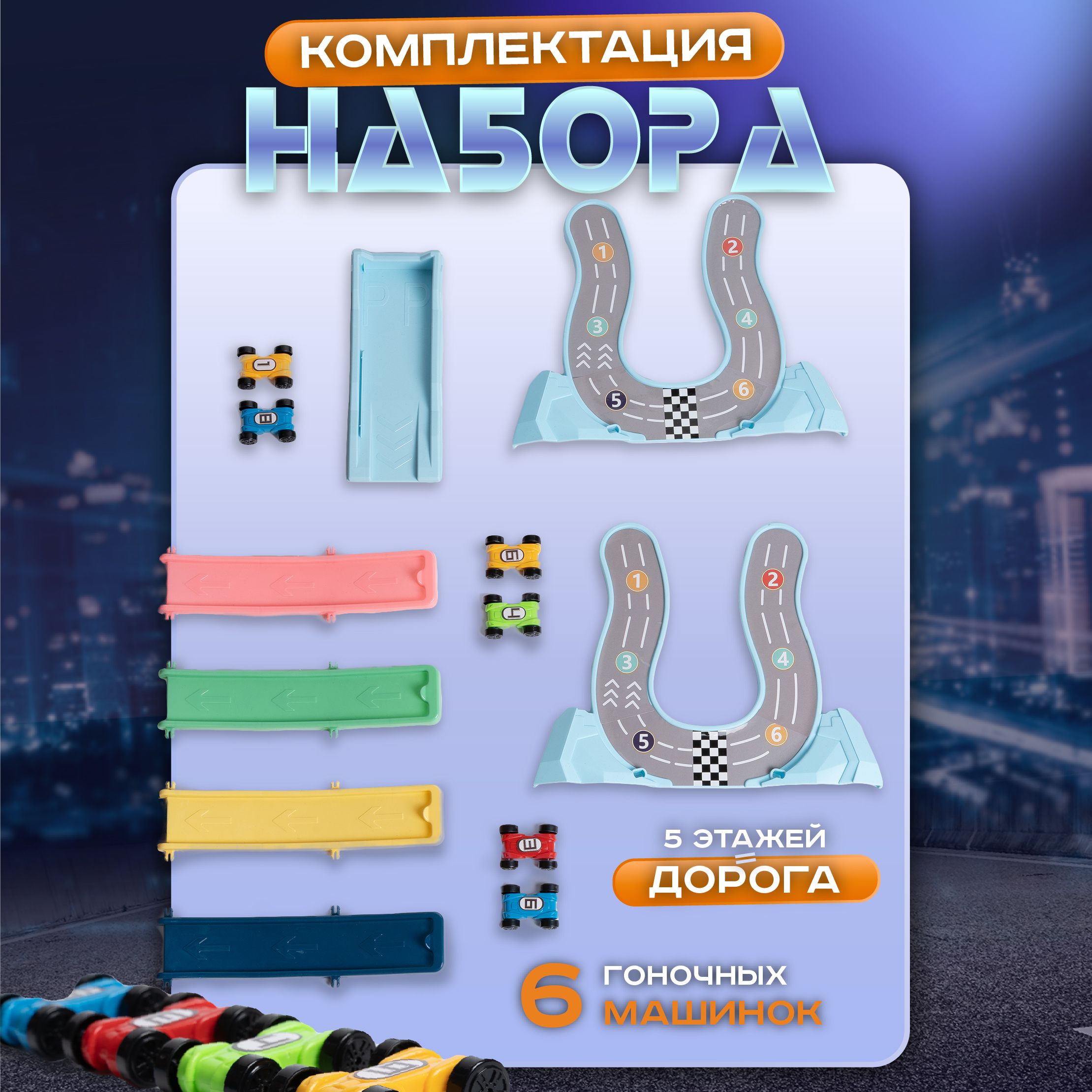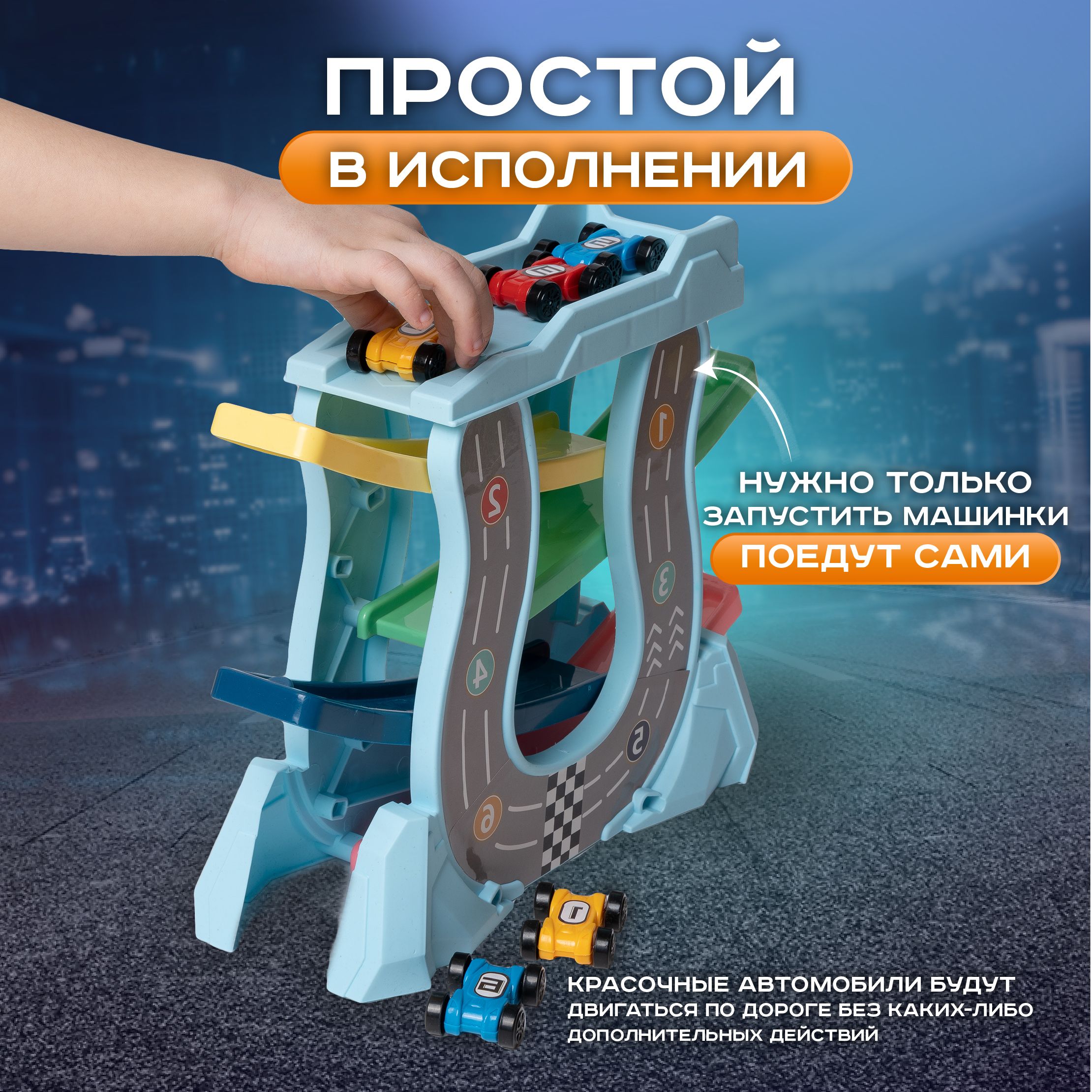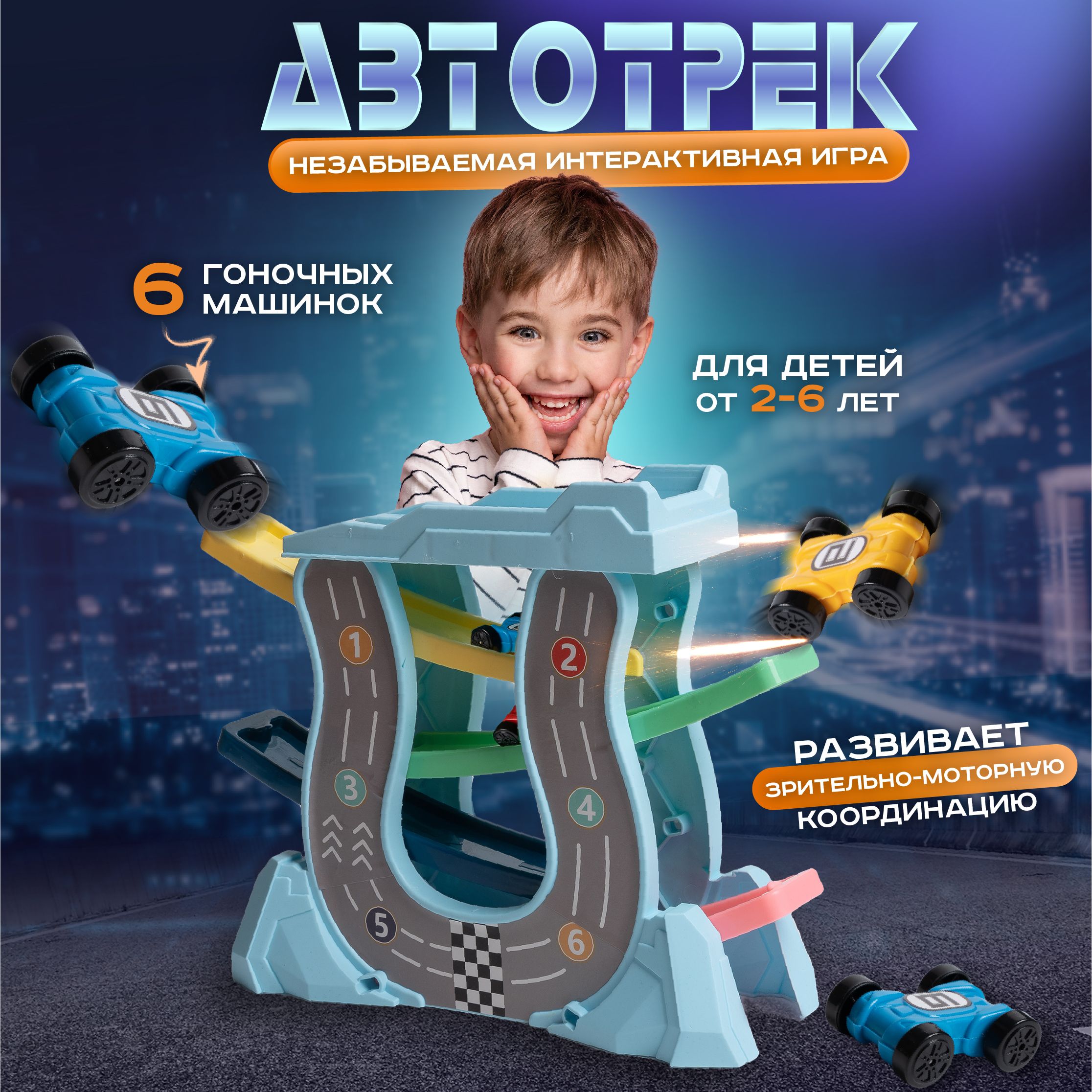 Описание: Автотрек с машинками 6 шт игрушечный транспорт для мальчиковАвтотрекер - это своеобразная игрушечная гоночная трасса со скоростными машинками, проходящими веселую и интересную для маленьких гонщиков траекторию движений со спуском. Извилистая автодорога с мини тачками развивает у ребенка мелкую моторику рук, координацию движений, способность к пространственному мышлению, фантазию, навыки конструирования. Автотрэк простой, без сложных элементов, мостов, трамплинов или мертвой петли, поэтому понятен малышам от 2-3 лет (2+) и старше. Все, что требуется - это запустить авто car поочередно и яркие машинки поедут по автотрассе абсолютно самостоятельно! Благодаря трансформации в автомобильные гонки, развивашка позволяет устраивать соревнования между несколькими детьми. Игра для любителей настольной автомойки, автопарковки, паркинга, парковки, автосервиса, быстрой горки, трека с эстакадой, другим транспортом. Умный игровой набор track racing выполнен из высококачественного нетоксичного ABS пластика.Комплект на подарок мальчику или девочке на 1,5, 2, 3 года, 4, 5 лет.