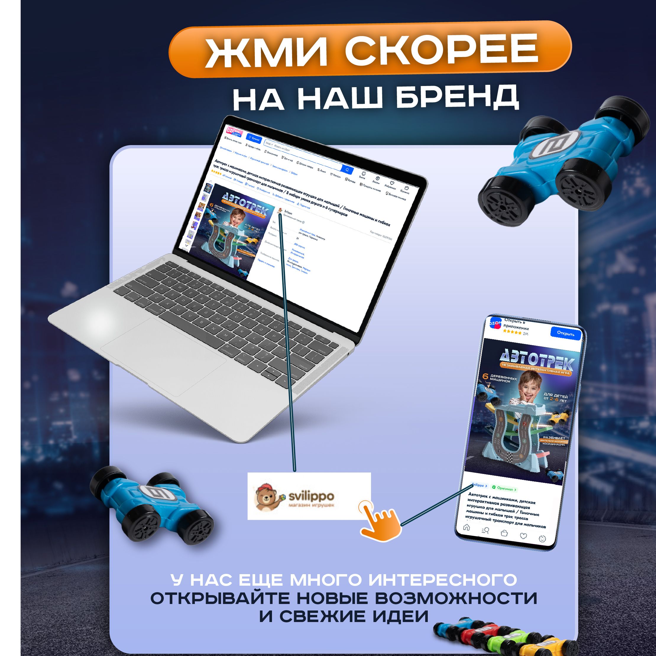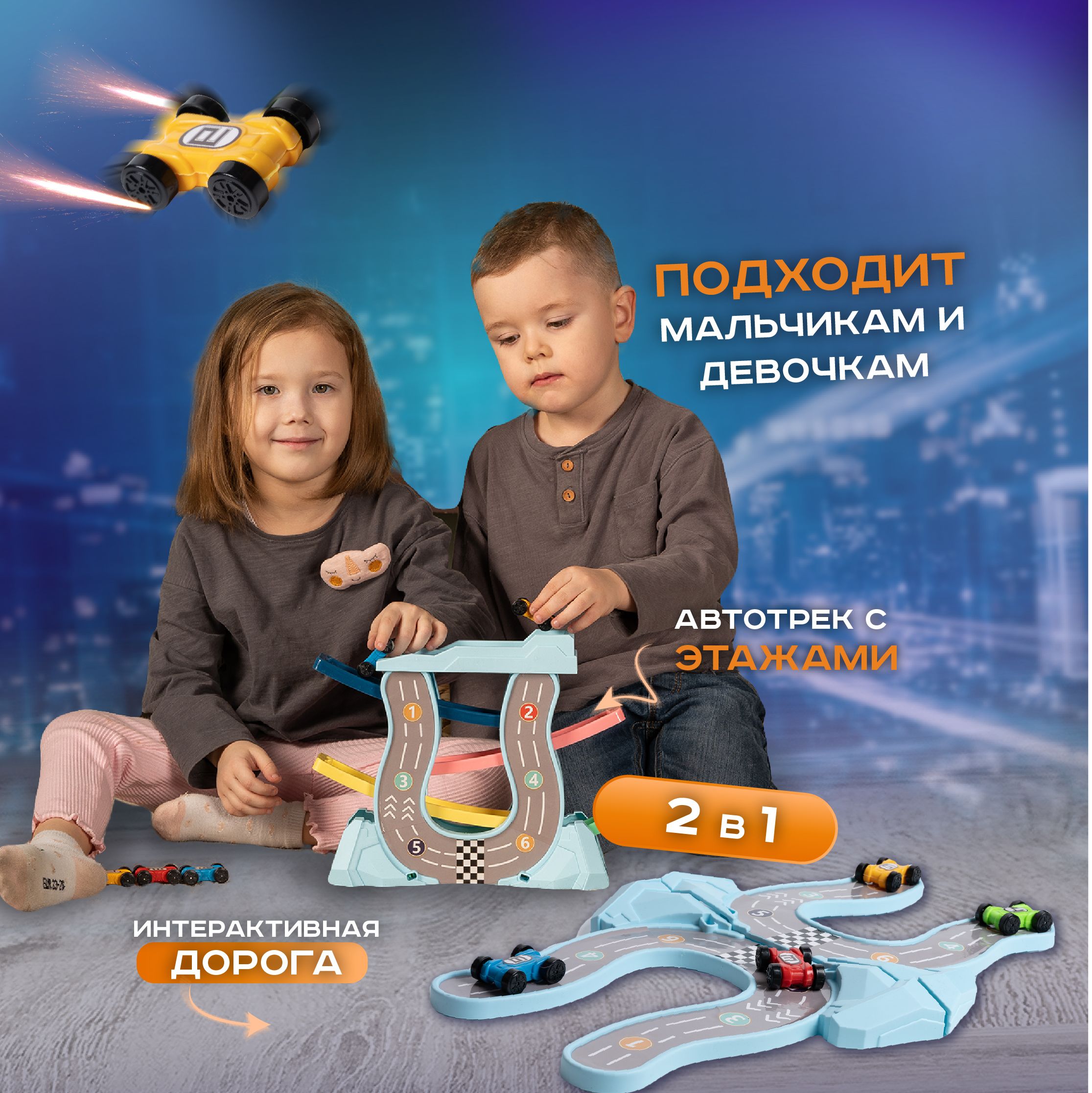 Автотрек с машинками, детская интерактивная развивающая игрушка для малышей / Гоночные машины и гибкая трэк трасса игрушечный транспорт для мальчиков / В наборе умная дорога и 6 суперкаров