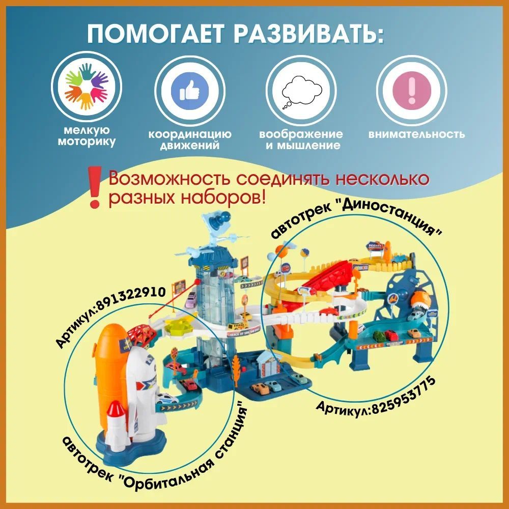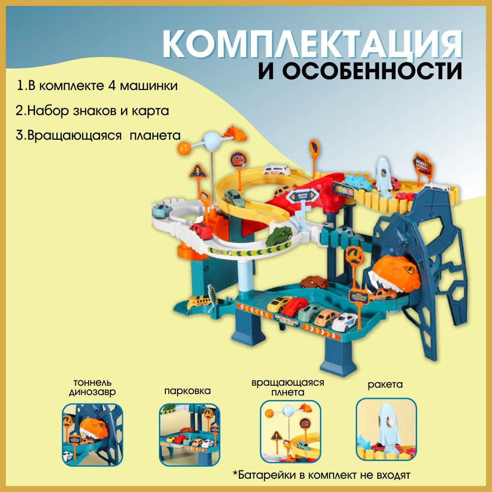 Описание: Диностанция - это не просто автопарковка для машин или гоночный трек, это целый мультипарк - интерактивная развивающая игрушка, которая увлечет с головой как мальчиков, так и девочек. Музыкальный многоуровневый автотрек с лифтом эскалатором, сложной системой крутых трасс и собственной ракетной станцией. В комплекте 4 машинки, вращающаяся планета, набор знаков, ракета, карта (батарейки в комплект не входят). Дорога для машин управляется блокираторами. Конструктор легко собирается, детали надежно стыкуются между собой. Паркинг детский изготовлен из качественного безопасного пластика.« Внимание! до запуска ракеты остается всего пара минут! Начинается обратный отсчет… Успеет ли машина доставить секретное донесение на базу?! Впереди сложный спуск вниз и опасный тоннель динозавров!»... Во время таких сюжетных игр у ребенка появляется интерес изучать мир, познавать новое. «А как летает ракета? А как работает лифт?» и много других вопросов появляется у маленького исследователя. С таким игровым комплексом ребенок играет самостоятельно или в компании с братьями сестрами, друзьями, родителями, забывая про планшет и телефон. Процесс сборки – создание целого города – это уже увлекательный процесс (на время которого частенько теряется не только малыш, но и папа)! Дарить чудо под силу не только Деду Морозу. Диностанция - замечательный подарок на Новый год или День Рождения для детей 3, 4 года, 5, 6 лет, а для взрослых лучший подарок – детские глаза полные восторга.