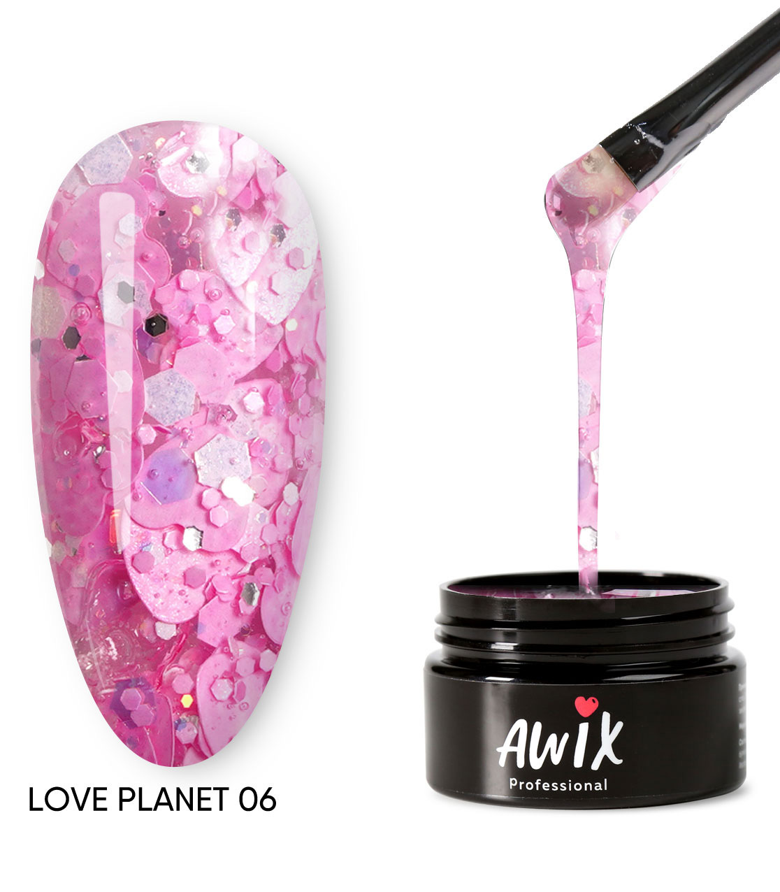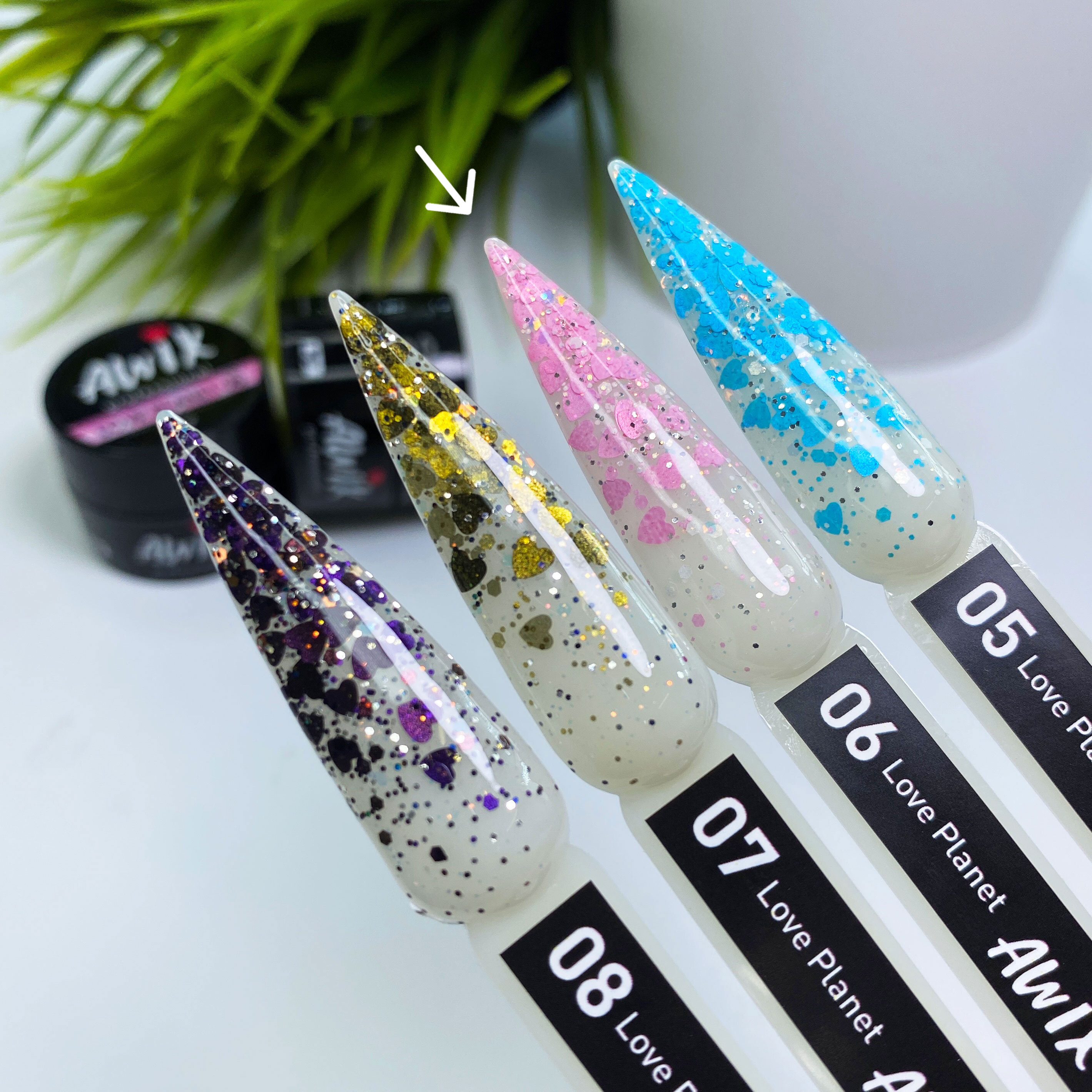 Awix, Гель лак Love Planet 06, 8 гр прозрачный для дизайна с сердечками, шестигранниками, блестками