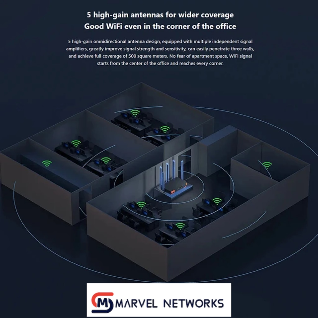 Конструкция всенаправленной антенны с 5 высоким коэффициентом усиления, оснащенная несколькими независимыми усилителями сигнала, значительно улучшает мощность и чувствительность сигнала, может легко проникать через три стены и достигать полного покрытия 500 квадратных метров. Не бойтесь квартиры, сигнал WiFi начинается из центра офиса и доходит до каждого угла.