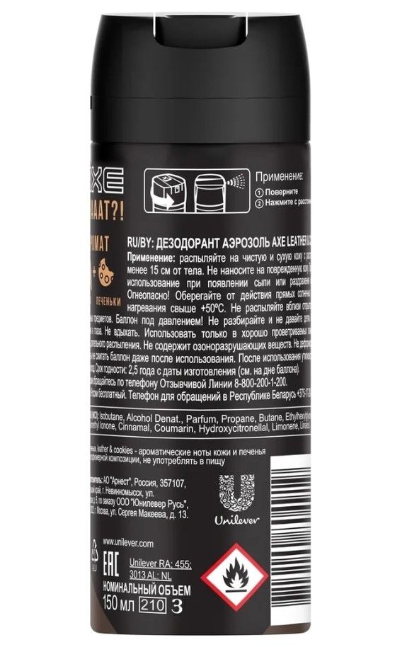 Описание: Взрывной аромат новинки AXE Кожа и печеньки сталкивает между собой дерзкий аромат брутальной кожи и теплый аромат домашнего печенья. AXE кожа и печеньки - неожиданно, но это работает!AXE – самый популярный мужской бренд в мире, знаменитый своими эксклюзивными ароматами и удивительными рекламными кампаниями. Каждый аромат AXE – это произведение искусства, созданное при участии легендарного парфюмера Энн Готлиб. В ассортименте бренда представлены все самые популярные форматы, существующие на рынке дезодорантов. Тем, кто ценит лучшие ароматы, AXE предлагает свои классические дезодоранты-спреи, разработанные при участи лучших парфюмерных домов мира. Аэрозоль Dark Temptation уже несколько лет является абсолютным бестселлером на рынке мужских дезодорантов. В 2018 году AXE запустил новый продукт – карандаши-дезодоранты в черных упаковках, которые повторяют три аромата-бестселлера AXE: Dark Temptation, Black и Anarchy. Дезодоранты AXE имеют антибактериальную формулу и препятствуют появлению неприятного запаха, но в то же время не содержат солей алюминия.Для тех, кто ценит практичность и надежную защиту от пота и запаха на весь день AXE представляет антиперспиранты в трех форматах: аэрозоля, стика и ролика. Все антиперспиранты бренда AXE легко отличить: вне зависимости от формата они белого цвета. Антиперспиранты-аэрозоли, карандаши и ролики серии AXE Signature созданы специально для мужчин, которые помимо своего аромата ценят и свой гардероб – помимо защиты от пота и запаха они не оставляют белых следов и желтых пятен на одежде.Гели для душа AXE – это гладкое и глубокое очищение по-мужски. Гели AXE делятся на два вида: некоторые из них имеют сногсшибательно-свежие ароматы, бодрящие и пробуждающие утром; другие – еще и могут быть использованы 2 в 1: как гель для душа, и как шампунь. Гели для душа AXE дерматологически протестированы.Шампуни AXE – это отличное дополнение к дезодоранту и гелю для душа, ведь стильный мужчина всегда одет в тон. В составе шампуня AXE Apollo (2 в 1) присутствует кондиционер, что очень удобно для мужчины. Наконец, в 2019 году AXE представляет 2 новинки: пена для душа и бритья 2 в 1: Gold и Cooper. Этот продукт мощно пенится, что позволяет и помыть и побрить тело!
