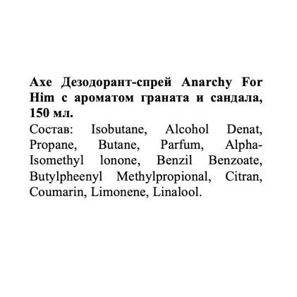 Axe Дезодорант-спрей Anarchy For Him с ароматом граната и сандала, 150 мл. Состав: Isobutane, Alcohol Denat, Propane, Butane, Parfum, Alpha-Isomethyl lonone, Benzil Benzoate, Butylpheenyl Methylpropional, Citran, Coumarin, Limonene, Linalool.