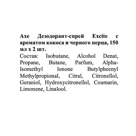 Axe Дезодорант-спрей Excite с ароматом кокоса и черного перца, 150 мл х 2 шт. Состав: Isobutane, Alcohol Denat, Propane, Butane, Parfum, Alpha-Isomethyl lonone Butylpheenyl Methylpropional, Citral, Citronellol, Geraniol, Hydroxycitronellol, Coumarin, Limonene, Linalool.