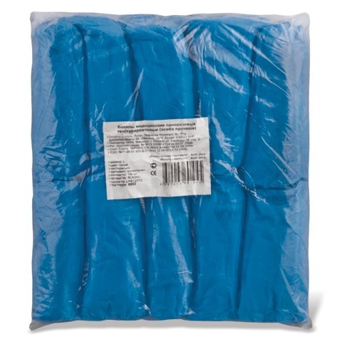 Медицинские бахилы из гладкого полиэтилена (полиэтилена высокого давления - ПВД, полиэтилена низкого давления - ПНД) на резинках. Гладкие полиэтиленовые бахилы более износостойкие по сравнению с текстурированными хлорополиэтиленовыми бахилами.