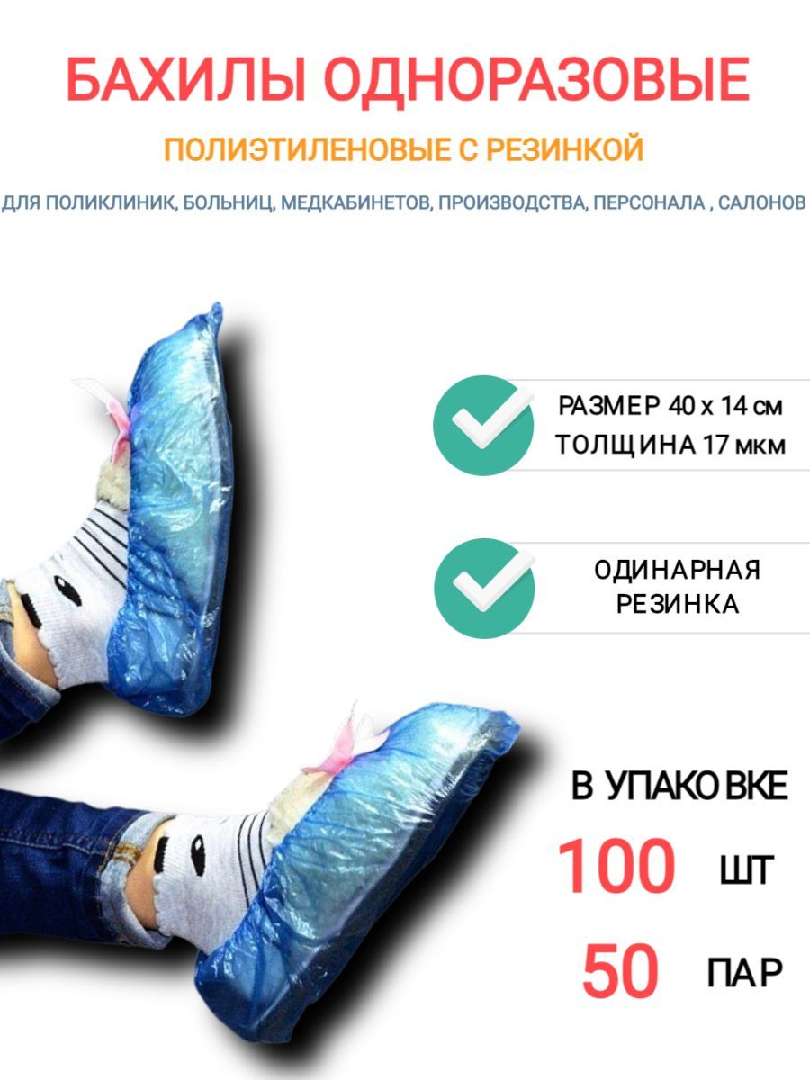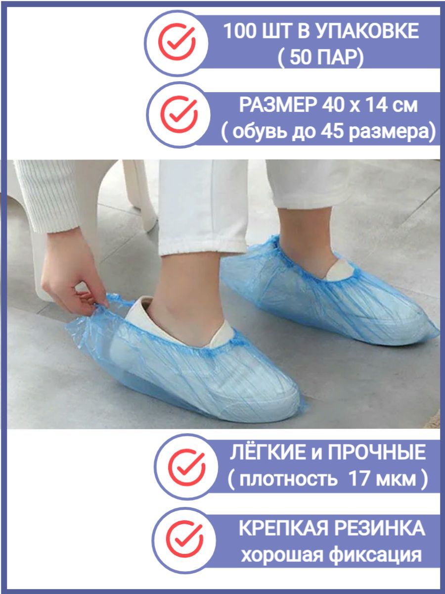 Бахилы одноразовые плотные медицинские синие комплект 100 шт (50 пар), 40х14 см, 17 мкм, ПНД