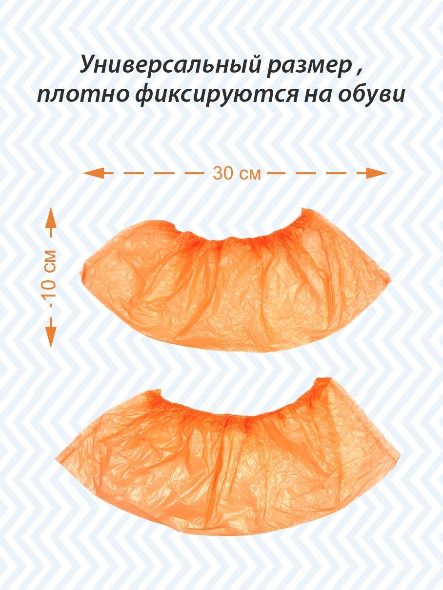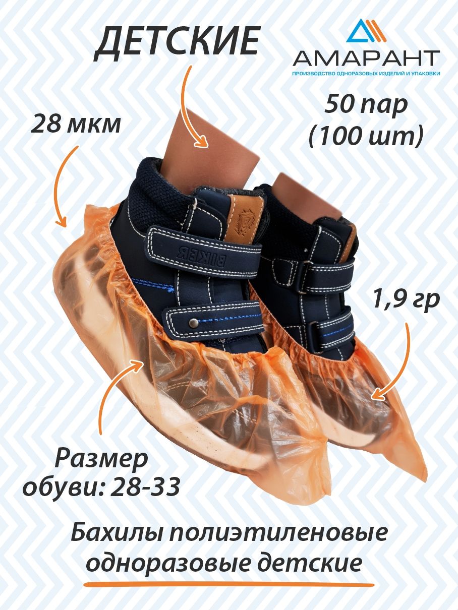 Бахилы полиэтиленовые одноразовые ДЕТСКИЕ для обуви, прочные, 50 пар (100 шт), ПНД, 28 мкм, оранжевые, Амарант