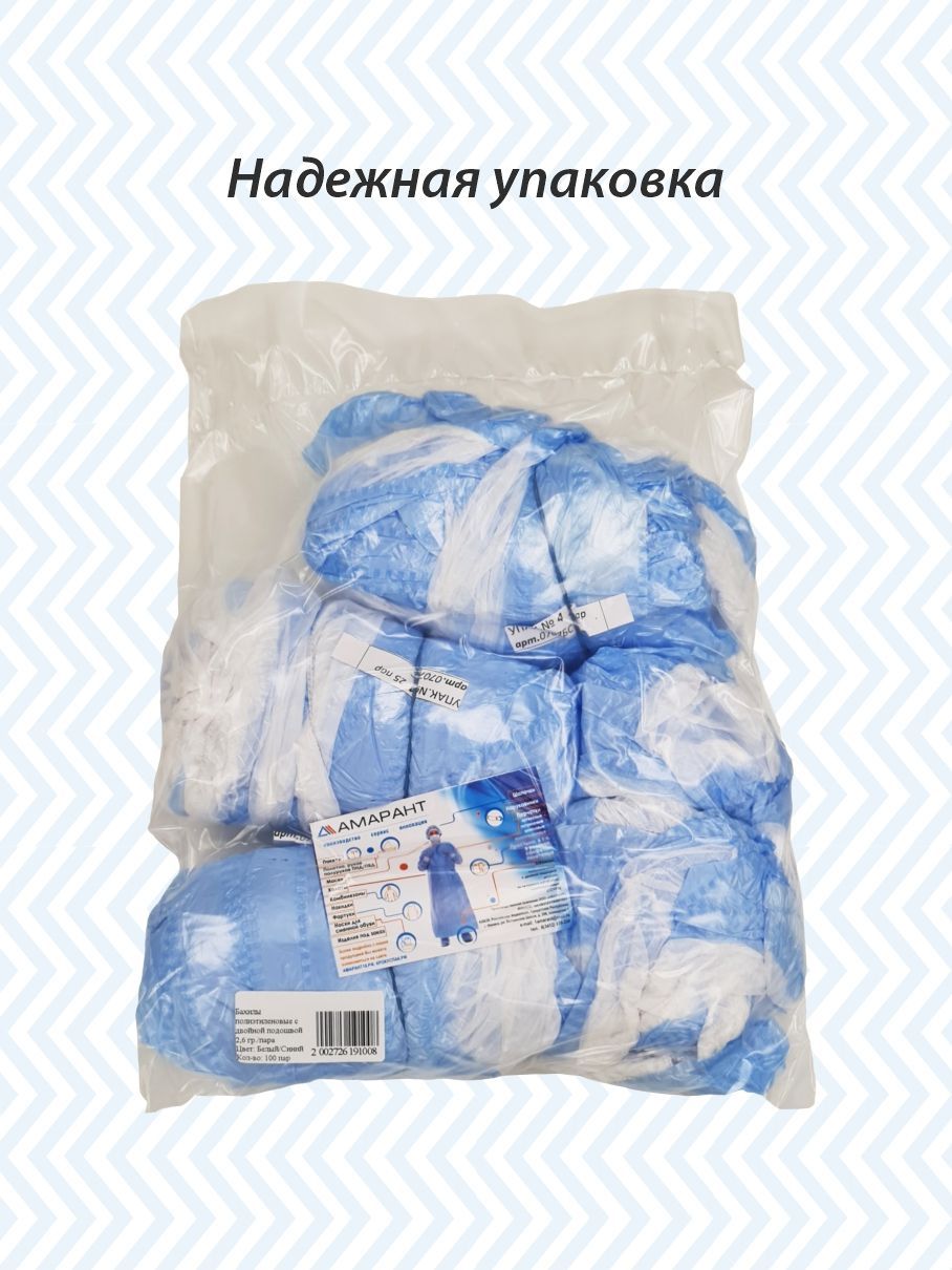 Бахилы полиэтиленовые одноразовые С ДВОЙНОЙ ПОДОШВОЙ, бахилы медицинские, для обуви, прочные, 100 пар (200 шт), ПНД, 28мкм, бело-синие Амарант